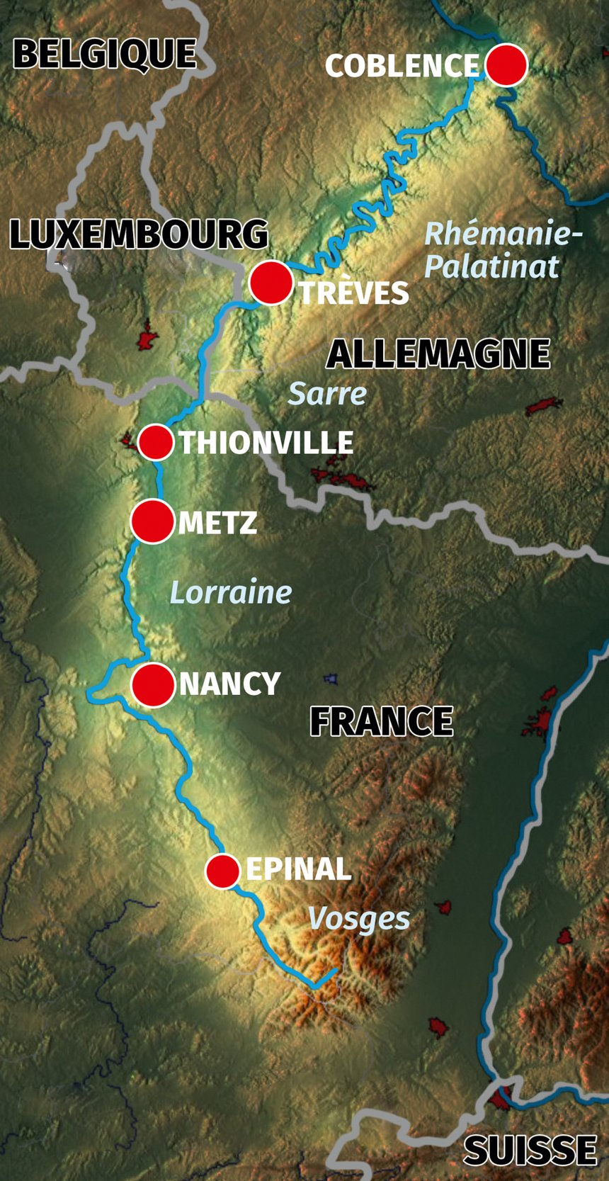 La rivière Moselle s’étend sur 3 pays frontaliers, la France avec 313 kilomètres de berges, le Luxembourg et l’Allemagne. Elle a de nombreux affluents, la Meurthe, la Seille, l’Orne etc. Elle prend sa source dans le massif des Vosges à Bussang et se jette dans le Rhin à Coblence, en Allemagne. Nous allons donc descendre cette rivière et faire une présentation des endroits les plus intéressants et prolifiques pour notre pêche car, aussi poissonneuse soit-elle, elle a aussi son lot de complexités. Cela fera sans nul doute gagner un temps précieux à tous ceux qui souhaiteraient s’y aventurer, car une vie de pêcheur ne suffirait pas à en percer tous les mystères.
