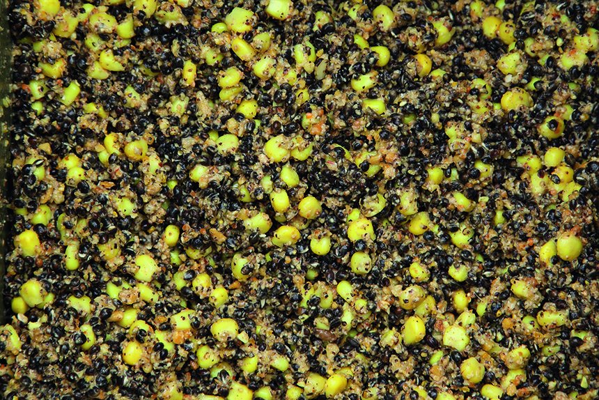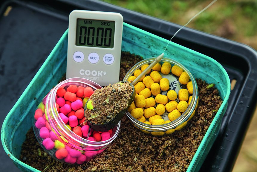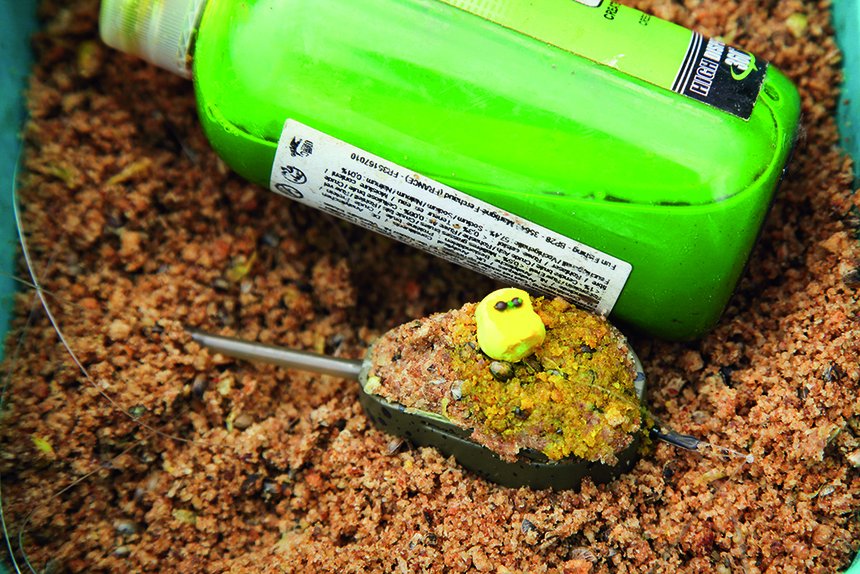 Quand je pêche sur un amorçage comme décrit ci-dessus, l’amorce sur le method-feeder n’a pas pour rôle de construire le poste. C’est l’amorçage au Spomb qui a ce rôle. La fonction de l’amorce sur le method-feeder est de présenter correctement l’appât piégé et attirer les amours blancs qui sont sur l’amorçage vers cet appât. Du coup, j’utilise un mélange qui travaille beaucoup, très attractif, sans forcément être très riche comme le sont habituellement les amorces method-feeder. Une amorce contenant une bonne part de chapelure (les amours adorent le pain) et que je mouille avec des graines broyées passées au blender sera parfaite. Les chènevis et maïs doux broyés grossièrement ainsi seront parfaits.