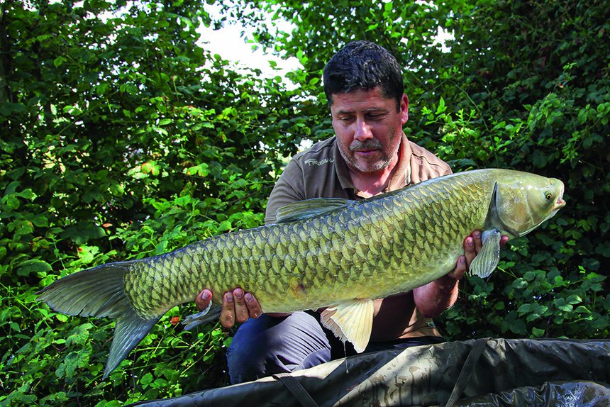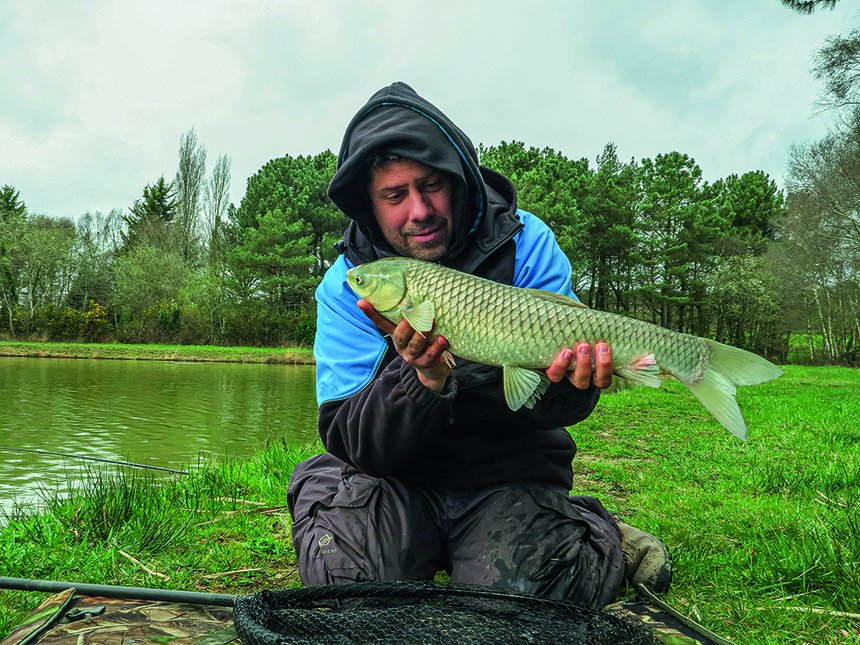 Je n’hésite pas non plus à rajouter du chènevis moulu sec pour que l’amorce travaille encore plus, surtout si je sens que la pêche risque de se faire décoller à la pop-up ou zig. Aux saisons plus froides quand les amours sont peu actifs, il m’arrive de les pêcher au method-feeder avec une amorce similaire à celle que j’utilise pour les carpes. Dans ce cas, une amorce spéciale method riche et carnée sera parfaite. Je mouillerais aussi des pellets de 2 mm pour construire le poste. Je commence une fois le sondage effectué et spot choisi par lancer deux à cinq « method » de pellets de 2 mm pour mettre un peu de nourriture grossière sur le poste. Puis je commence avec juste de l’amorce sur le method pour le côté attractif. Et ensuite, en fonction de l’activité et de la réaction des poissons, je ne mets que des pellets ou un mélange amorce/pellets. Dans les plans d’eau où amours et carpes sont présents ensembles, cette façon de faire n’est pas sélective et on prend aussi bien des carpes que des amours blancs. Si je veux tenter de sélectionner un peu plus les amours blancs, je peux alors utiliser soit une amorce riche en chapelure et/ou maïs et pauvre en farines carnées. Il m’arrive même d’utiliser du pain de mie broyé ou du baby-corn fondu. Cette façon de faire peut-être efficace à la saison froide, particulièrement si les poissons blancs type brèmes ou gardons ne sont pas trop nombreux. Dans le cas contraire, je préfère garder une amorce carnée et des pellets de 2 mm et prendre des carpes plutôt qu’être « embêté » par les autres poissons blancs.