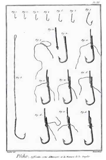 Dans la Grande Encyclopédie de Diderot et d’Alembert (1750-1765), deux planches illustrent la façon dont étaient fabriqués les hameçons à la fin du XVIIIe siècle. Le haut de l’illustration ci-dessous met en scène trois ouvriers occupés à l’arrière d’une boutique.