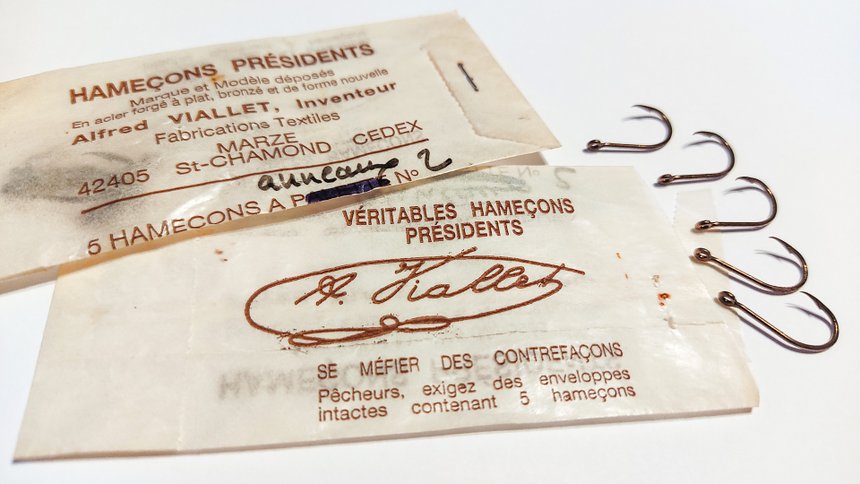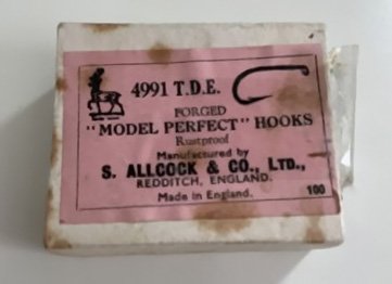 En revanche, sur la photo, un hameçon très similaire à celui que Richard Walker utilisera en 1952 pour capturer Clarissa, à savoir un « Model Perfect » de la société Samuel Allcock & Co., basée à Redditch! En 1984, Jo Nivers répondant à un lecteur1 regrettait que « très peu de fabricants se donnent la peine de produire et de proposer des hameçons spécialement consacrés à la pêche de la grande carpe, estimant sans doute, que le marché était trop restreint […] » et poursuivait en disant qu’ils cèdent, s’ouvrent, et ne retiennent plus le poisson, voire cassent si la trempe est trop faible. Lui pêchait avec des « Présidents forgés et bronzés » et quelques autres modèles, avant de découvrir et de ne plus utiliser que des hameçons à dorade, très solides, indéformables et ayant une pointe extrêmement pénétrante.
