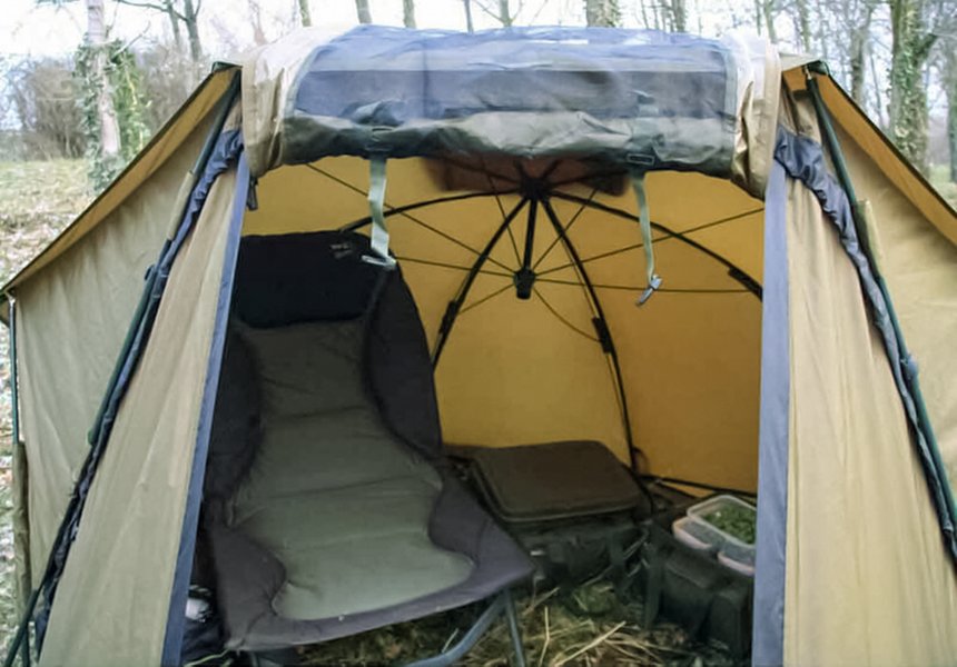 Composé d’une toile 210 deniers imperméable et possédant une tête hydrostatique de 5000 mm, il est livré avec une façade avant amovible intégrale, comprenant une fenêtre centrale de type moustiquaire pouvant être remplacée par une fenêtre transparente, un tapis de sol de bonne facture avec système Velcro pour le solidariser du brolly, deux mâts tempête et un jeu de sardines à vrille dans leur étui, l’ensemble logeant dans un sac de rangement d’un encombrement très raisonnable. Les dimensions globales de l’abri sont standards pour un brolly: 2,60m de largeur pour une hauteur de 1,45m. C’est largement suffisant pour recevoir un bed-chair standard, une table de biwy, et loger tout le matériel qui nécessite d’être abrité, comme un carry-all, le fourreau de canne, le matériel photo, etc.