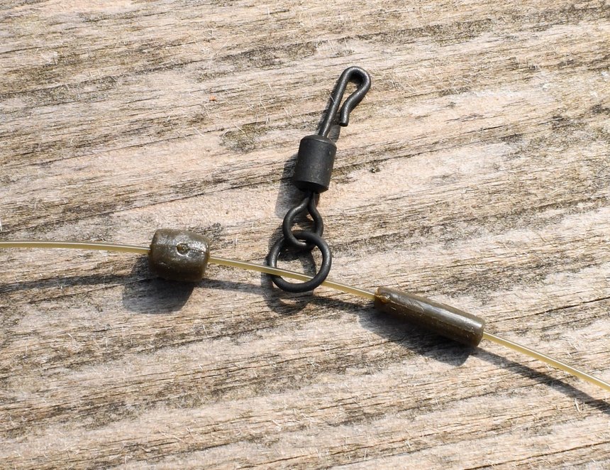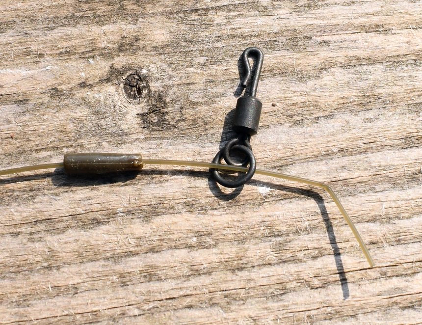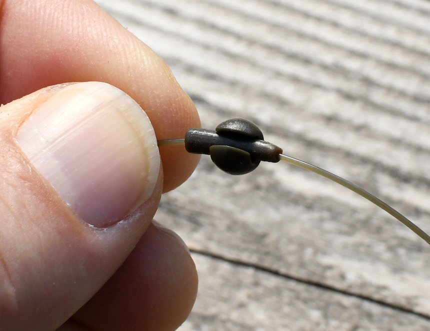 7 On place ensuite un manchon « hélicoptère » en caoutchouc, et on noue une agrafe « quick link » qui permet de fixer le plomb et d’en changer facilement.