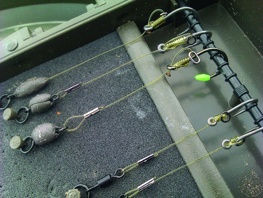 Face à la pression de pêche, notamment à Savay, plusieurs montages furent inventés. Le D Rig est un de ceux-là. Il a été mis au point par Roger Smith vers 1985, en réalisant une boucle en nylon pour que l’hameçon reste en bouche et ne soit pas soufflé avec l’appât. C’est aussi une façon de décaler le centre de gravité vers la pointe. Toujours à Savay, à peu près à la même époque (1986), Martin Locke et Rob Maylin partaient du principe de reculer l’hameçon plus loin à l’intérieur de la bouche, pour qu’il y reste un peu plus longtemps et qu’il ait ainsi un peu plus de chance de basculer et de piquer. Locke raconte que pour ajuster ses montages aux bouillettes de 24 ou 30 mm il ajouta un morceau de tube à la hampe du Gamakatsu n° 10 avec lequel il pêchait. C’est ainsi que naquit le Looney extension avec lequel il captura Sally, une commune de 39 lbs ! Le principe du Bent hook (hameçon coudé) a été développé par Jon Holt en 1986-1987, alors qu’il pêchait à Longfield, une des eaux considérées comme les plus difficiles d’Angleterre à l’époque. L’idée était que la pointe bascule et accroche rapidement dès que l’esche était saisie. Au début des années 1990, Partridge hooks commercialisera deux hameçons coudés, le Ritchie MacDonald (Z13) et le Piggyback bent hooks (Z14). Malgré le fait qu’ils basculaient très bien, les bent hook ont été interdits parce qu’ils piquaient souvent loin dans la bouche, accrochant les chairs tendres et faisant des boutonnières. Le principe mécanique a néanmoins été repris et amélioré dans bien des montages ultérieurs (aligneurs de ligne, kickers…) et forms d’hameçons modernes. À Woburn Sands, Martin Clarke inventa une version « souple » du D rig, le Slip D Rig, pour que l’appât puisse s’écarter de la hampe de l’hameçon. La plus-value réside dans la liberté accrue laissée à l’hameçon de basculer, donc à augmenter le ratio de touches transformées. Il améliora sa version de 1986-1987 en 2002, avec l’utilisation des tresses gainées pour avoir une partie souple et un bas de ligne plus rigide. C’est Dave Chilton – Kryston – qui a commercialisé en 1995 la première tresse gainée, la Snake-Skin. Vers 1990 Steve Renyard conçu le montage Withy pool pour pêcher le syndicat du même nom. Il en a basé la courbure sur le contour de la lèvre inférieure d’une carpe, de sorte que tout poisson qui l’aspire se pique, idéalement au milieu de la lèvre inférieure. Steve Renyard a également inventé l’Hermit rig (montage élastique) pour essayer de piéger les poissons qui se déplacent lentement ou sans aller bien loin entre chaque bouchée. L’Aligneur de ligne a été mis au point par Jim Gibbinson en 92/93 pour faire tourner plus rapidement l’hameçon dans la bouche des carpes. C’est le préfigurateur des actuels kickers. Le Blow Back Rig est un montage conçu par Kevin Nash (1996) dans lequel une gaine en silicone maintient le cheveu sur la hampe. Cette gaine, qui peut reculer lorsque la bouillette est soufflée et faire en sorte que la pointe tombe, sera ensuite remplacée par un anneau coulissant (ring) auquel sera noué le cheveu. C’est également Nash qui réalisa les premiers clips plomb en 1992. Vers 1996/97 Tim Paisley et Dave Chiltern mettent au point le Combi-Rig pour limiter les emmêlements mais aussi pour rendre l’éjection plus difficile en associant un morceau de tresse en partie terminale et une partie rigide en Amnésia. Aujourd’hui on utilise des loop en tresse que l’on raccorde à des booms en fluoro ou, à l’opposé, on fait des « combi inversés » revenant à l’esprit du looney extension.