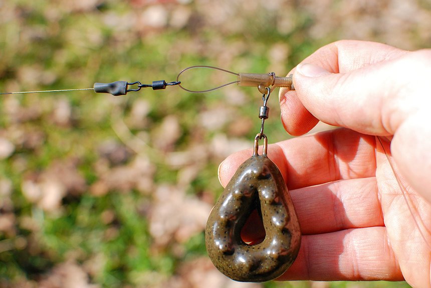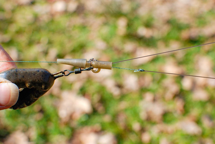 La version qui suit est quant à elle réalisable très simplement avec le matériel dont vous disposez déjà certainement dans votre tackle box : un clip-plomb classique et un petit foret à esche. L’idée directrice est de permettre au corps de ligne de se libérer intégralement en cas de casse, y compris lorsque l’on utilise une tête de ligne de fort diamètre raccordée par un nœud nécessairement volumineux, pour ne laisser que le bas de ligne en prise avec le poisson. Un montage particulièrement adapté aux pêches fortes, en lacs, fleuves ou rivières où les obstacles sont bien présents.