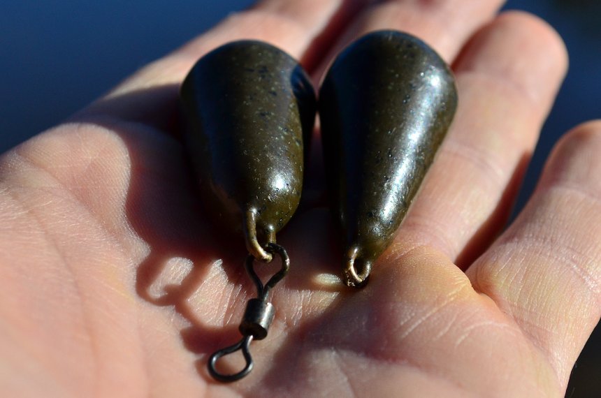 Par exemple, en les collant presque au plomb j’obtiens un montage très proche dans son effet mécanique d’un système classique à clip-plomb, avec tous ses avantages d’inertie quasi-immédiate du lest lorsque le poisson engame l’esche. Il est également possible de réaliser le même montage directement sur une tête de ligne de nylon de gros diamètre, sans utiliser de leadcore. Je peux évidemment changer la forme et le grammage du plomb à loisir, et même le remplacer par un caillou monté sur cassant lorsque je dépose loin dans des berges pentues.