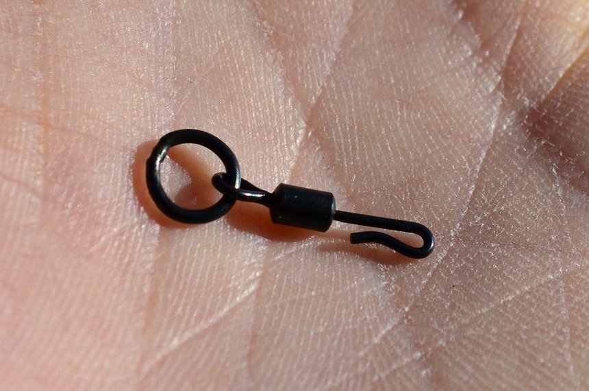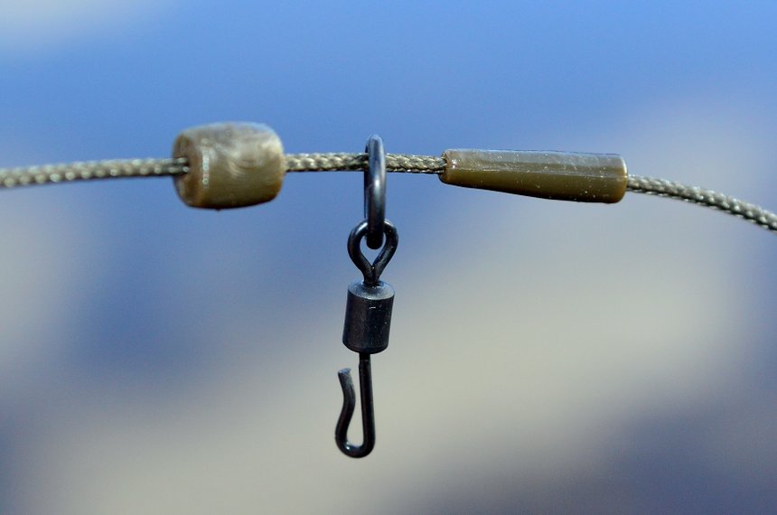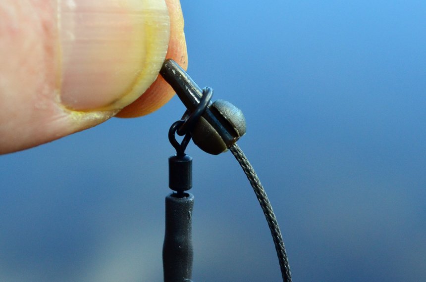 En adaptant légèrement cette base, j’ai décliné un montage qui permet de changer le bas de ligne rapidement sans rien avoir à couper (gain de temps !), grâce à un émerillon spécial appelé « QC Ring Swivel », proposé par plusieurs marques sous différents noms, et à l’utilisation d’un morceau de leadcore assez long (80 cm minimum). Je peux ainsi passer en quelques secondes d’un bas de ligne classique en fluorocarbone ou en tresse de mon choix, à un petit « chod rig » de quelque centimètre. En plaçant les perles à différentes distances du plomb situé en tête de montage, je peux adapter le système au type de fond.