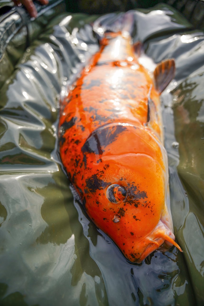 Jeudi, j’ai une touche sur une ligne tendue à 40 m du bord, sur une cassure présentant un changement de substrat. Le poisson revient sur ma droite, vers la berge encombrée. J’arrive à mouliner assez vite pour garder le contact quand j’aperçois une touffe d’herbier bloquée sur le nœud de la tête de ligne, et 15 m plus loin un poisson aussi rouge orangé que la vigilance météo de la veille. J’ai desserré le frein comme pour mieux serrer les fesses dans l’espoir d’une issue (qui fut) favorable.