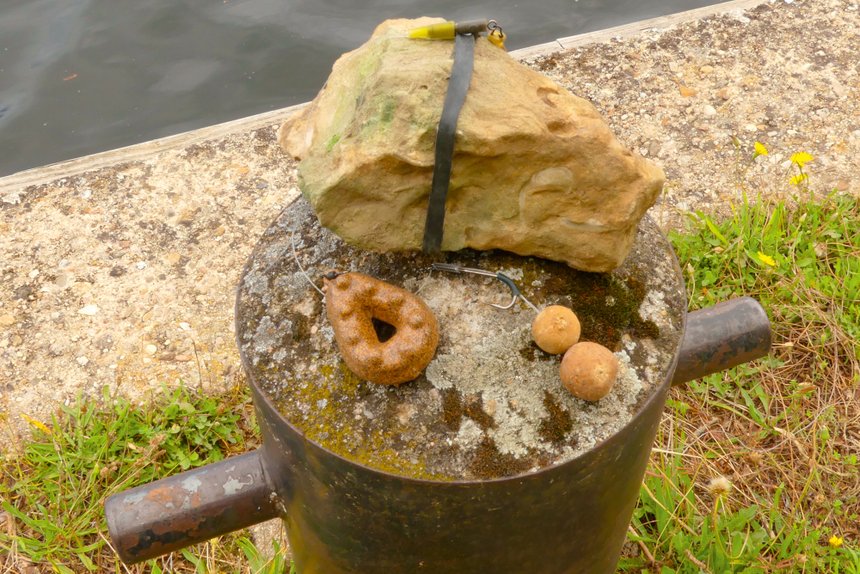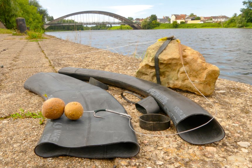 Plusieurs solutions s’offrent à nous et deux facteurs principaux sont à prendre en compte. La poussée de l’eau et les débris végétaux transportés. Si les veines d’eaux et périphéries de courant sont entourées de zones calmes, un simple plomb suffira (bien que je lui préfère un caillou détachable). En revanche, si l’eau comprime trop les bannières ou charrie trop d’herbiers dérivants – et c’est un cas d’école en rivière –, il faudra s’adapter. Dans le cas d’un courant propre sans trop de débris, une pierre détachable au vu de son poids rendra notre piège opérationnel bien plus longtemps qu’un simple plomb, couler les bannières amènera plus d’efficacité, car le courant est toujours plus faible en profondeur. Dans certains cas extrêmes, il m’arrive d’utiliser des lests qui passent le kilo pour que ça tienne. Pour cela, les chambres à air de mobylette, fat bike ou mountain bike seront parfaites. Elles sont larges et permettent donc d’être couplées à de gros lests qui supporteront la pression exercée sur la bannière sans les déplacer. Généralement, une chambre à air de VTT ou de gros élastiques suffisent à entourer une petite pavasse de 300 grammes qui permet de faire tenir un montage. Les choses se compliquent avec les herbiers dérivants, que l’on peut classer en deux familles : les grands herbiers (renoncule aquatique, potamots, myriophylles, callitriches, jussies…) et les petites algues filamenteuses (algues vertes filamenteuses, algues brunes…). Dans les deux cas, ces plantes et algues aquatiques impactent sévèrement la pêche quand elles sont promenées par le courant. Elles viennent s’agglutiner sur la bannière et rendent vite le montage inopérant. Pour y remédier, la seule solution radicale que je connaisse est de pêcher en dérivation. Plusieurs solutions s’offrent à nous : en voici deux que j’ai retenues pour continuer à pêcher malgré ces herbiers baladeurs.