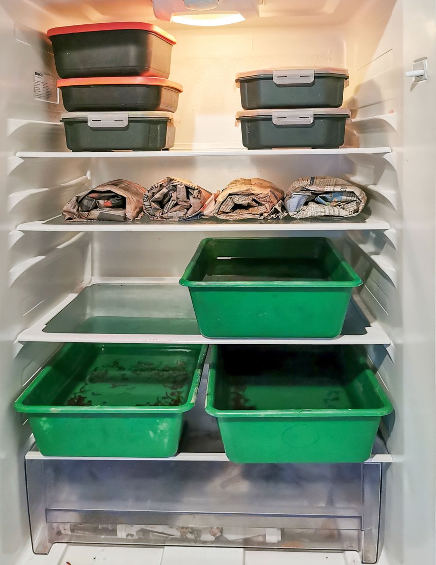 Le fouillis doit être stocké au froid lui aussi. Pour une répartition uniforme de la température, l’idéal est de le conserver à plat, mais il est aussi possible d’en faire des rouleaux pour optimiser l’espace. J’évoque rapidement la conservation du fouillis « frais » qui, après ouverture du paquet, comme toute denrée périssable, doit être consommé rapidement après ouverture (une semaine tout au plus si les larves sont jeunes et beaucoup moins si elles sont proches de l’éclosion). J’agis différemment pour le fouillis russe. Si je sais que je vais l’utiliser de suite, je me contente de le placer au réfrigérateur. Si je souhaite le conserver pour plusieurs sorties, j’opère un « lavage » préalable et un remplacement des journaux dans lequel il a été transporté. Un passage sous un jet d’eau froide dans une épuisette à mailles très fines ou une toile de rideau suffit à évacuer les boues résiduelles qui peuvent « gangréner » le journal. Après quelques passages à l’eau claire et un essorage en règle, puis un emmaillotage dans un journal propre et humide, le tour est joué. La durée de conservation est doublée, voire triplée si le fouillis est bien frais. Il suffit d’ouvrir le paquet de temps à autre et de surveiller le taux d’humidité. La couche supérieure de larves ne doit pas sécher et elles ne doivent pas coller au journal. Un coup de vaporisateur permet de se prémunir du séchage. Après une partie de pêche et si vous ne retournez pas au bord de l’eau, il est possible de congeler les restes de fouillis. Mais si vous avez envie ou besoin de faire un stock car vous n’avez pas de calendrier fixe, l’idéal est de congeler du fouillis frais par petites quantités (250 g) en prévision des périodes de disette (avril/mai) ou pour vos pêches d’hiver.