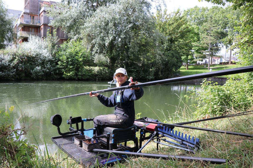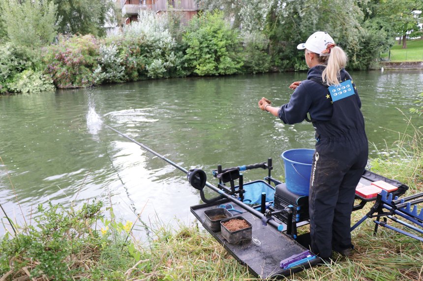 La taille des boules d’amorce de départ et de rappel de Solène ne trompe pas mais elles produisent l’effet escompté à coup sûr: elles cognent joliment et très précisément la surface. Pour garder les poissons sur un coup subissant un bon courant et le passage des bateaux, elle va devoir relancer une boule d’amorce de la taille d’un petit œuf tous les quatre à cinq coulées. Tandis que l’amorce gonfle, donc, vient le temps de l’installation. Celle de notre championne a été pensée et repensée pour pêcher confortablement, en toute sécurité, et optimiser tous les gestes car la pêche en rivière est tout sauf statique.
