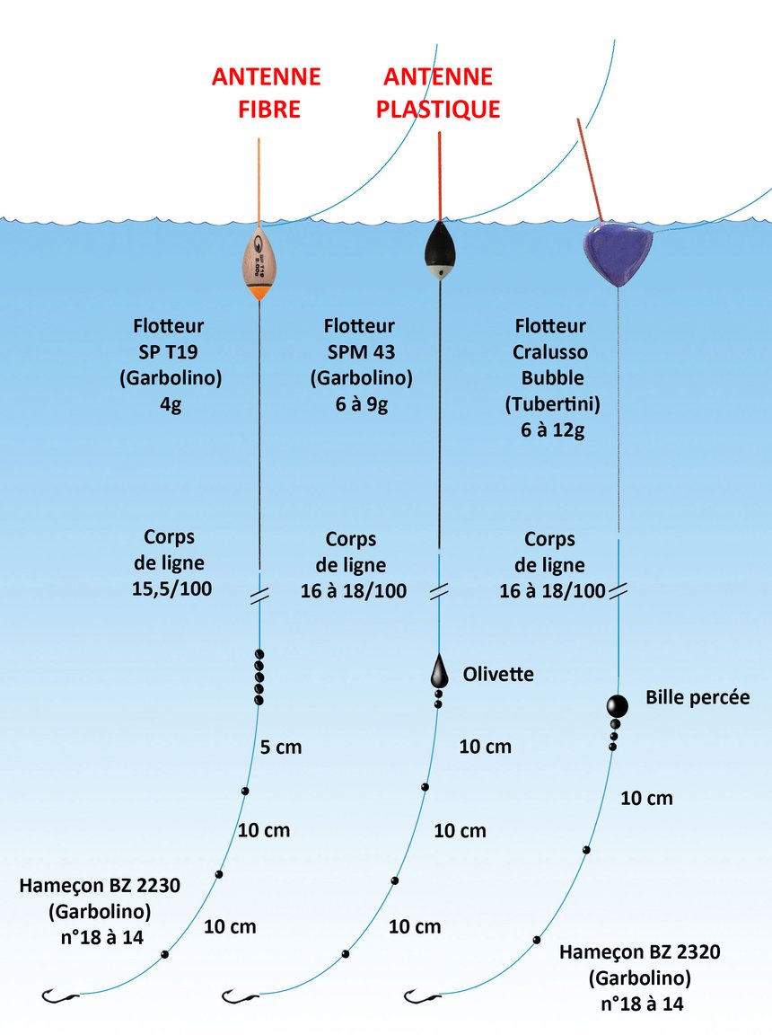 En général, après l’amorçage lourd initial, les petits poissons, moins méfiants, rappliquent assez rapidement. Les plus jolis mettent un peu plus de temps. Cette donnée contraint Solène à prévoir plusieurs montages de lignes, équipés de flotteurs de poids et de formes différentes. En rivière, la forme boule donne un flotteur très stable, facile à guider dans le courant. Il suffit ensuite d’aguicher en pratiquant des retenues plus ou moins prononcées pour permettre aux poissons de se saisir de l’esche. Solène utilise deux flotteurs d’apparence identique mais dont la matière et le diamètre de l’antenne diffèrent (voir montages).