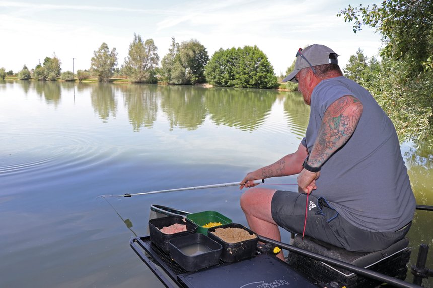 Avant de rencontrer Carl, je comparais cette approche à une pêche d’attente. J’étais loin du compte. « Ce n’est absolument pas une pêche statique, proteste Carl. Jusqu’à ce que les poissons arrivent, ma ligne reste entre 40s et une minute en place, pas plus ! » Notre champion prépare toujours plusieurs coups : en pleine eau et en bordure, à gauche et à droite quand c’est possible, dans un mètre d’eau, sa profondeur favorite. Comme il ne peut pas alimente avec sa pâte tous ces coups en permanence, il signale sa présence en jetant quelques grains de maïs ici et là. Son scion est équipé de deux coupelles de scion, l’une pour déposer la pâte à l’aplomb, l’autre du maïs. La pâte est un appât sélectif, péché mignon des très grosses carpes. Celles-ci sont souvent solitaires d’où l’intérêt de multiplier les coups et les options. Tant qu’il a des touches ou est certain de la présence de poissons, Carl exploite le même coup. Pour éviter un remue-ménage, il extirpe tout poisson ferré en force grâce à son nylon costaud et à un élastique intérieur de fort diamètre, assez court.
