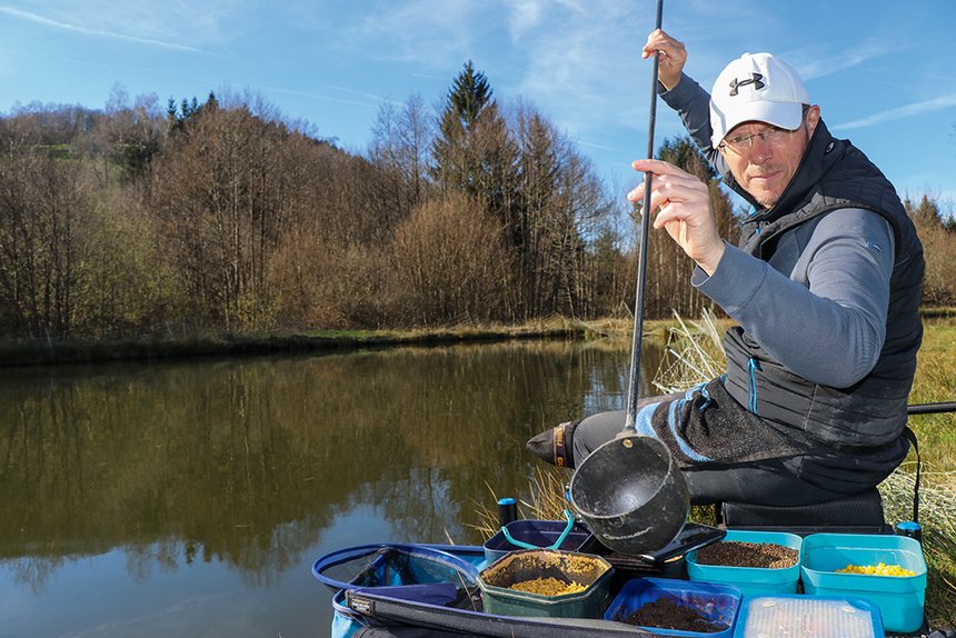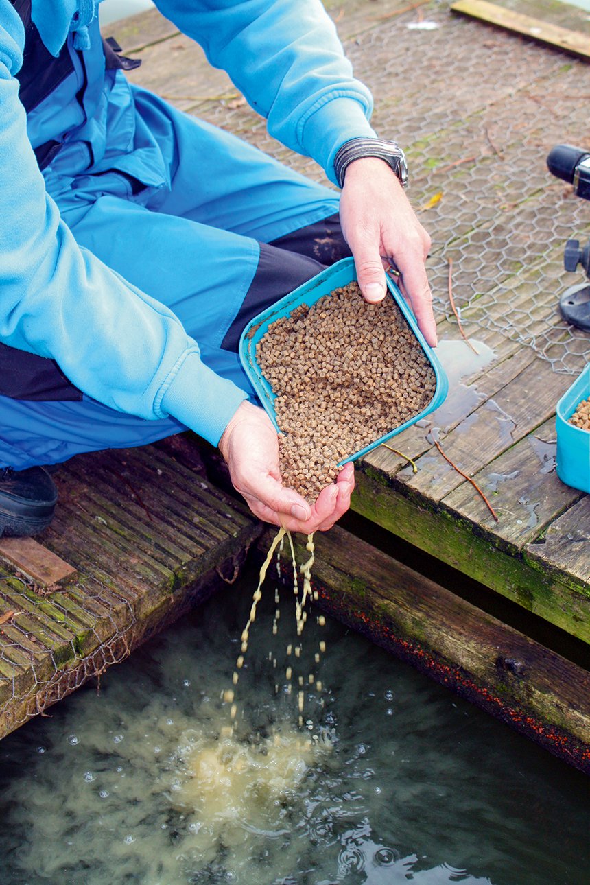 Les poissons des étangs typés fishery sont habitués aux granulés. Ils y ont été élevés et en sont nourris durant l’année. Mon amorçage est donc exclusivement composé de pellets de 3 mm. Je trouve que c’est un diamètre polyvalent. Suffisamment petit pour être gobé par les petits sujets, suffisamment gros pour ne pas être dispersé sur le fond si les gros poissons y fouillent en nombre. Et si jamais le vent se lève, je me garantis que les granulés gagnent le fond malgré les mouvements d’eau. Pour attaquer, je dépose des granulés secs qui sont actifs dès le contact avec l’eau. Je prends également soin d’en tremper une partie qui va se gorger d’eau pendant trois minutes. Après les avoir essorés, ils gagneront le fond plus rapidement et seront plus stables. J’y recours dès que les poissons sont installés pour les maintenir sur mes coups, préparés soigneusement à l’aide de la coupelle. Si je n’utilise que des pellets pour amorce, je dispose d’esches variées pour mon hameçon : asticots, vers de terre, pellets mous et maïs. Une gamme d’appâts naturels et artificiels qui séduit à peu près tous les poissons. Leur avantage est d’être sélectif, ce qui m’évite d’être ennuyé par les éventuels petits sujets. Je commence par un fond de coupelle de granulés et ne m’interdis pas d’agrainer quelques asticots qui vont aussi orner mon hameçon. Ainsi le risque est minime. Je construis ma pêche et j’augmente le rythme d’amorçage si nécessaire. Si les touches sont rares et/ou ne vont pas crescendo, je reste en mode « frugal ».