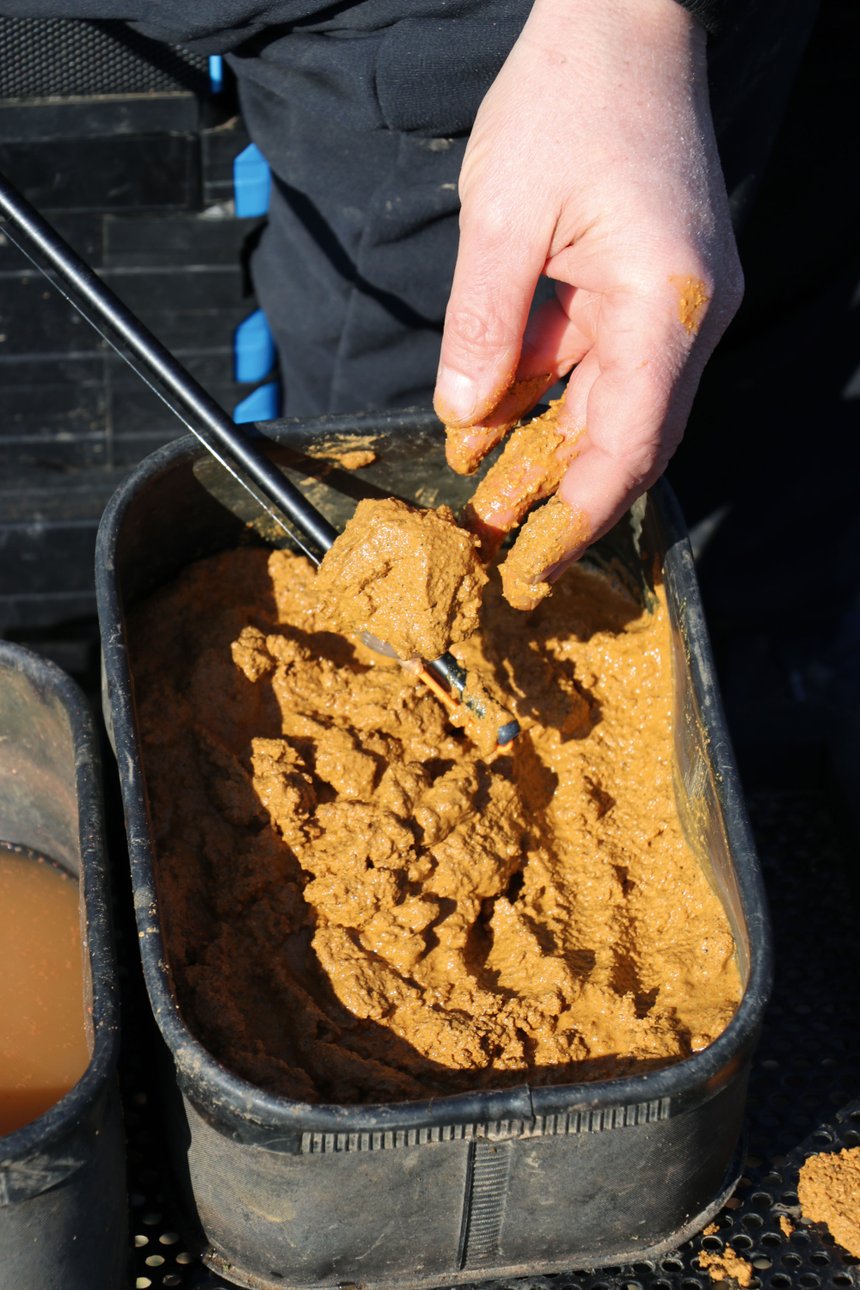 Un mouillage léger donne un mélange très friable, utile lorsque le fond est irrégulier, en pente ou fortement envasé. C’est souvent le cas lorsque l’on pratique sur les bordures latérales. Dans ces cas de figure, je privilégie une amorce non serrée. Je la déverse en pluie à la coupelle d’amorçage profonde pour que la quantité soit suffisante pour couvrir une bonne surface. Elle s’étale alors sur le fond pour former un véritable tapis dont les particules restent très accessibles. Discrète, cette approche est imparable surtout lorsque les poissons sont nombreux. Ils sont contraints de fouiller sans relâche, mais peuvent le faire sans se bousculer.