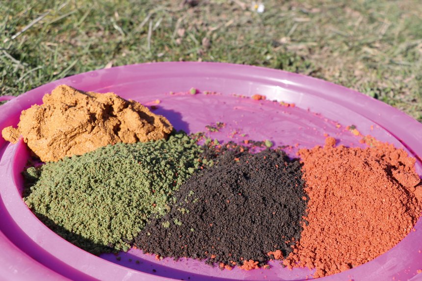 La nature du fond et la couleur de l’eau aident à déterminer celle de l’amorce. En fin de printemps et tout l’été, les poissons sont en plein pic d’activité. Les eaux sont troublées par leurs fouilles incessantes sur des fonds parfois recouverts de micro-algues et autres résidus. Le moment est idéal pour utiliser une amorce verte. Visible, elle s’active et se réactive en formant un halo caractéristique dès que les poissons fouillent. C’est en fait la couleur passe-partout par excellence. Sur un fond de graviers ou argileux, la teinte rouge est efficace. Aussi surprenant que le vert, même vif, c’est un coloris polyvalent que l’on peut utiliser tout au long de l’année. En ajoutant une proportion variable d’un mélange noir, on va pouvoir obtenir un résultat brun plus ou moins prononcé permettant de se rapprocher de la nature et de la couleur du fond. En fin de saison, lorsque les eaux s’éclaircissent et se rafraîchissent franchement, la carpe ne cesse pas pour autant totalement son activité. Mais elle devient plus méfiante et rechigne à s’installer sur un tapis d’amorce clair. Un mélange sombre voire noir est alors bien utile.