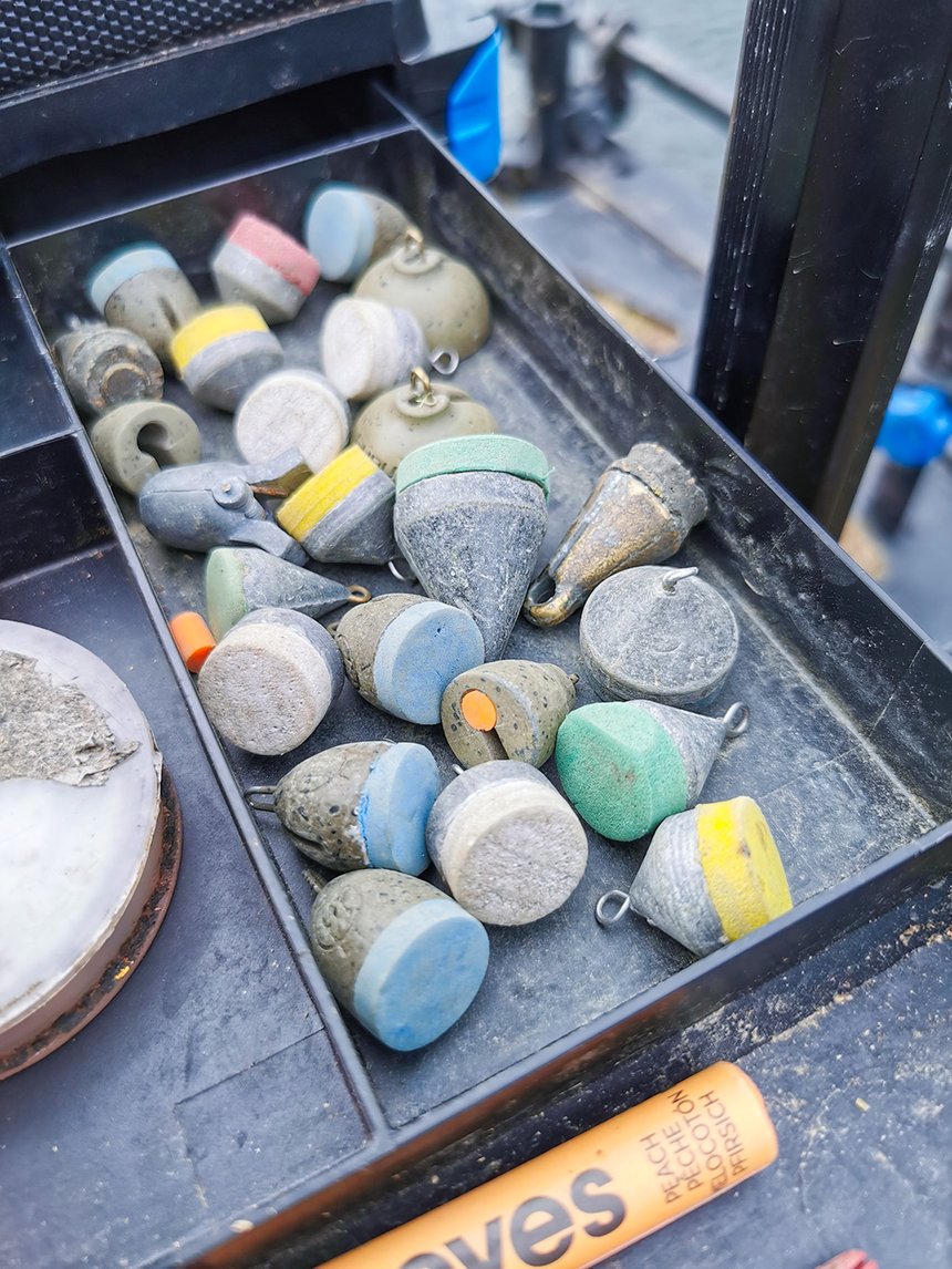 Inconcevable d’aborder une partie de pêche sans évaluer précisément la profondeur du poste. Il faut plusieurs sondes non seulement de poids mais de formes différentes. La plupart d’entre nous pratiquent sur des lieux de pêche différents, tantôt calmes comme les étangs à plus agités comme les rivières, de faiblement profonds à plus creux. Et la perte d’une sonde doit toujours être envisagée. Mon casier renferme des modèles pyramidaux, offrant le maximum de précision dans la majorité des cas (de 10 à 40 g) et des traditionnelles sondes grenouilles que je peux positionner directement sur mes plombs si besoin.