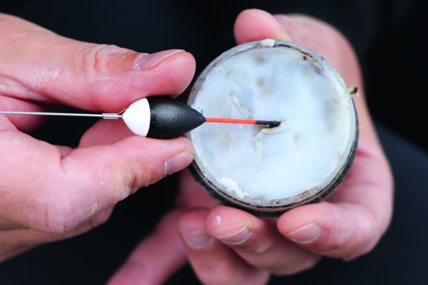 Je promène ce petit pot depuis de nombreuses années. Il s’agit de graisse pour l’entretien des soies de pêche (Mucilin) dont l’utilisation a été détournée. Il suffit d’y tremper tout ou partie de l’antenne d’un flotteur pour la faire poindre davantage à la surface. Petit conseil, équilibrez votre flotteur au plus juste et badigeonnez-le de graisse au bord de l’eau, cela confère une hypersensibilité au flotteur. Il existe des graisses colorées, mais je préfère la pâte naturelle qui, même si elle marque le Nylon à proximité, ne perturbe pas la lecture des touches.