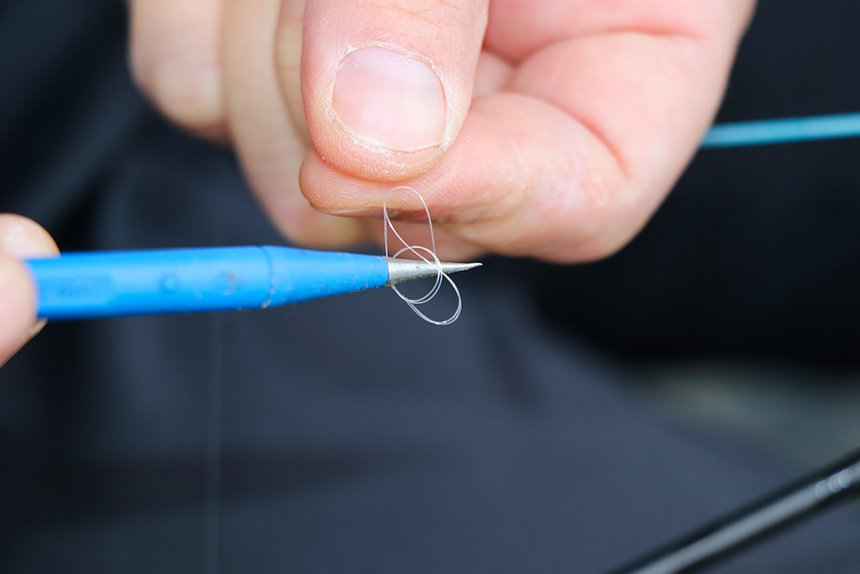 Que ce soit un modèle de couturière classique ou un outil spécial pêche, l’aiguille me sert à défaire les emmêlements les plus inextricables, mais aussi à confectionner de petites boucles. J’utilise une pointe très fine dont la base s’élargit afin d’ouvrir les nœuds formés lors d’une mauvaise manipulation.