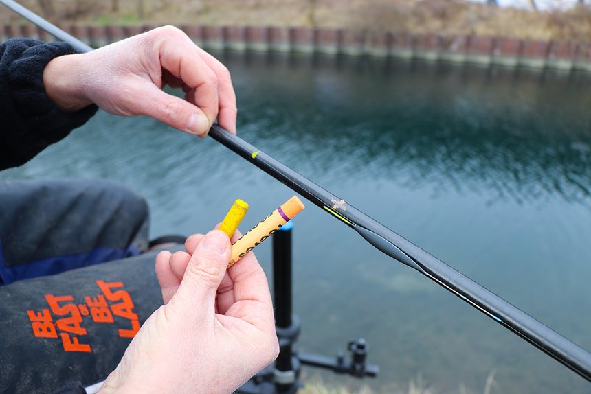 Marquer la position initiale de son flotteur après sondage est essentiel afin de pouvoir y revenir facilement. Je marque le carbone de ma canne, fixe ou à anneaux, à l’aide d’un crayon gras. Jaune, orange ou blanc. Il s’applique aisément et il se retire avec un simple coup d’éponge.