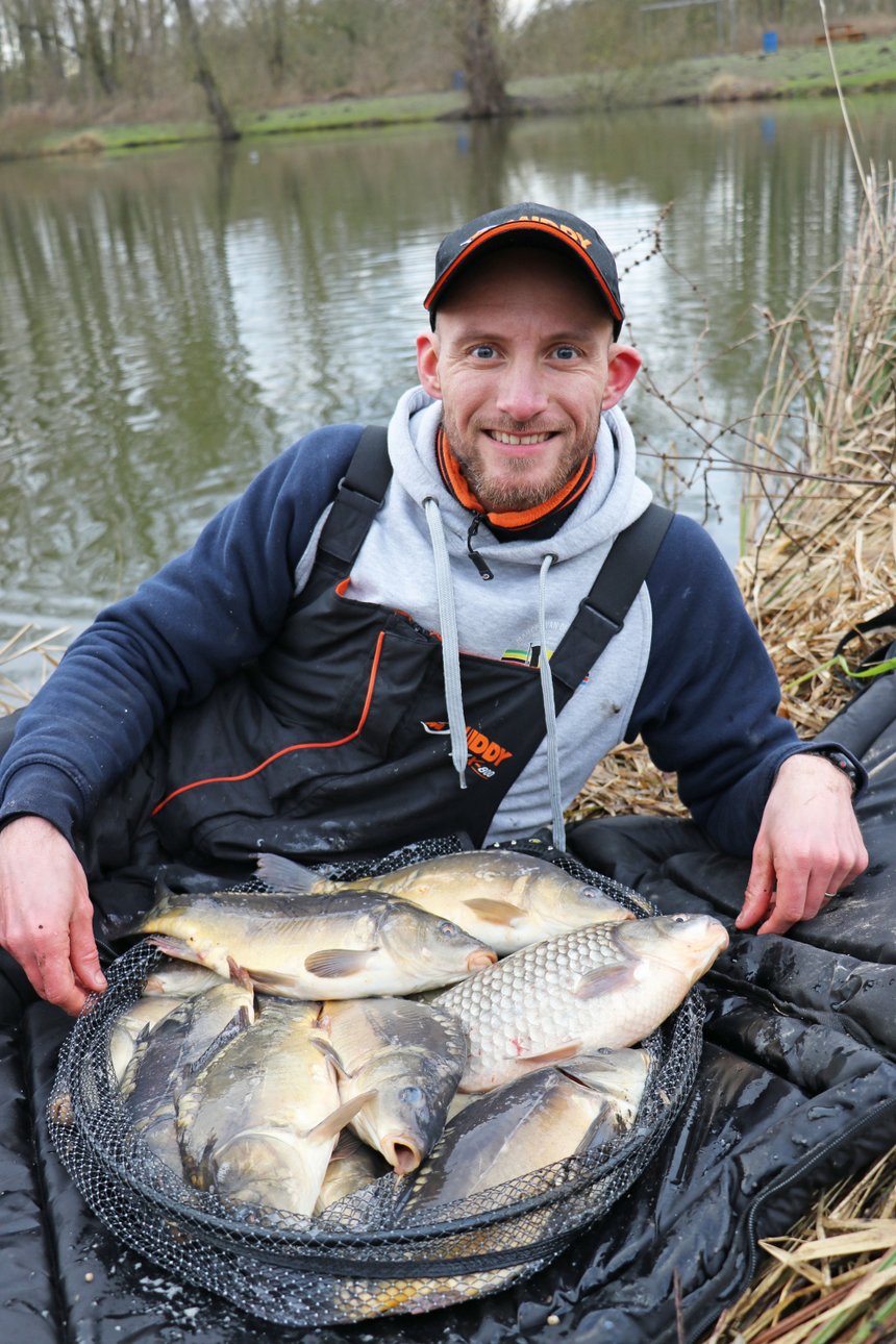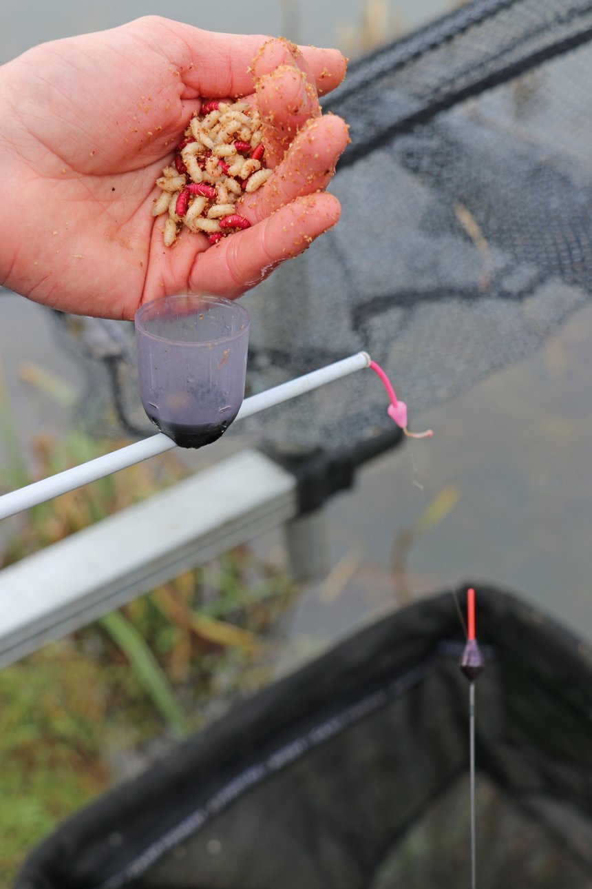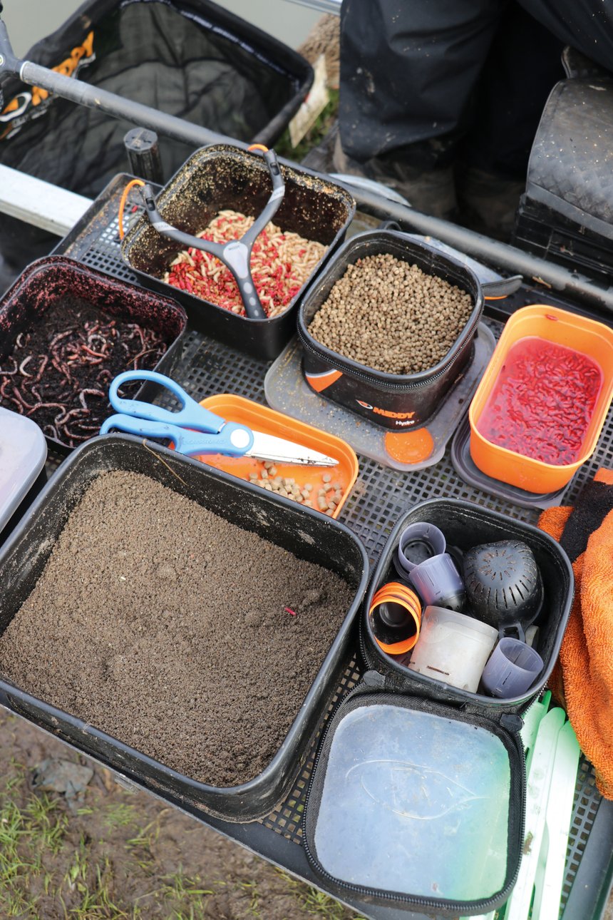 Pellets durs et mous, asticots, amorce, vers de terre, maïs, pain… Thomas dispose de quoi trouver l’esche du jour. « J’attaque toujours aux micro-granulés de 2 mm, digestes et peu nourrissants, me fait-il remarquer. Les poissons y sont habitués tout au long de l’année, je ne prends pas de risque. » Sur l’hameçon, il pique un pellet mou. La coupelle de scion permet un amorçage millimétré. Ce qui est sur le fond ne peut être repris aussi, en déposant peu, si l’approche n’est pas bonne, il n’hésite pas à changer pour ne pas perdre son rythme de touches. Thomas démarre à mi-distance, avec un fond de coupelle et patiente jusqu’aux premiers signes de présence. Ensuite seulement, il redépose des appâts et observe si le rythme des touches varie dans un sens ou dans l’autre. Si c’est positif, il ne change rien et reste jusqu’à épuisement des touches. Puis il passe à un autre coup, sans s’interdire de revenir vers le précédent à tout moment. Le comportement des poissons dicte ces va-et-vient. Si les touches sont franches, c’est qu’ils mangent, si elles sont plus timides, c’est un signe de défiance.