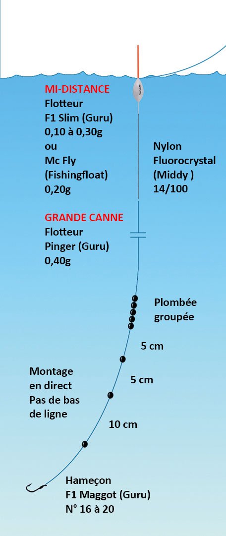 Mais Thomas veut aller plus loin encore, au-delà de la pointe de son scion, avec une très longue ligne (entre 4 et 7 m). S’il n’y a pas de vent, il utilise un montage avec un flotteur classique, plus lourd que celui utilisé pour pêcher sous la canne (0,60 à 1 g). Un lancer en balancier suffit pour déposer la ligne à distance. Mais si le vent est présent, il monte alors un petit waggler et gagne ainsi en précision et en discrétion car il évite d’utiliser un flotteur classique volumineux. Cette approche, bien connue sous le nom de franglaise donne à la ligne une excellente stabilité. Le long flotteur, lesté tout en bas, permet de limiter la dérive de la longue bannière, immergée elle aussi lorsque le scion est légèrement enfoncé sous l’eau. Ce dernier coup, le moins conventionnel, s’adresse aux poissons les plus méfiants et Thomas ne l’amorce pas au préalable ou de manière très parcimonieuse. « Je n’y recours qu’en fin de pêche pour ne pas y bloquer les poissons trop tôt, précise-t-il. Souvent, je le tente même sans amorçage préalable !» Dans tous les cas, Thomas se contente d’un agrainage délicat, avec moins de dix asticots à la fois. Bien qu’étant le moins amorcé de tous, ce coup lointain n’en est pas moins productif car les poissons s’y sentent nettement plus en sécurité.