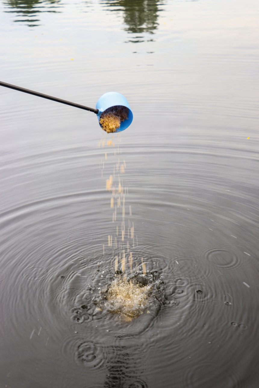 Les grains de couscous cuits sont trop collants et légers pour être frondés en quantité et précisément sur le coup. Nicolas se sert donc de la coupelle d’amorçage qui lui permet de le déposer pile où il le souhaite et avec la dose juste. Pour attirer et maintenir les poissons en haleine, il multiplie les va-etvient à l’aplomb de son coup. Le contenu est déversé de haut pour attiser la curiosité des carpes. La régularité et la précision de l’amorçage permettent, à force de persévérance, de créer une sorte de colonne dans laquelle les carpes virevoltent littéralement. À terme, la concurrence fait rage. Comment Nicolas calcule rythme et quantité ? « Comme pour l’ablette, c’est la règle du peu mais souvent qui prime, mais seulement au début… En effet, une fois que les carpes arrivent, ce sont de véritables aspirateurs et il n’est pas rare de déverser des coupelles entières. » Je connais bien Nicolas et il n’a pas la réputation d’avoir la main légère en matière d’amorce, mais sa manière de faire s’explique aisément. Une fois immergés, les grains de couscous forment une sorte de pluie fine, que le passage des carpes peut rapidement disperser dans la largeur et la hauteur, zone que s’empresse d’explorer Nicolas. Il faut maintenir une présence continue de grains pour s’assurer de celle des carpes à proximité.