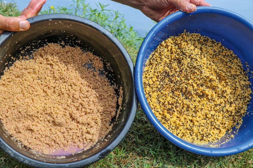 « Versez le couscous dans un bac, recouvrez d’eau, laissez reposer quelques minutes et c’est prêt ! » Nicolas plaisante sur la préparation, mais elle est aussi simple que cela. Il est tout à fait envisageable de faire gonfler les grains à l’eau froide puisque l’important est qu’elle imprègne le couscous pour qu’il gonfle. L’utilisation d’eau chaude accélère toutefois le processus. Vous avez donc le choix de préparer cela chez vous, mais si en arrivant au bord de l’eau, vous préparez vos grains, ils seront prêts le temps que vous vous installiez. Le couscous peut être utilisé pur, mais il peut aussi facilement être teinté en ajoutant un colorant à l’eau de trempage. Nicolas apprécie de booster le sien parfois (cf. encadré). Il prépare aujourd’hui deux mélanges distincts, l’un couplé avec du chènevis épicé dont le jus de conservation sert à humidifier le couscous et un second où l’eau est complétée d’un additif liquide qui va imprégner les graines à cœur. Évidemment, il ne s’agit pas de jeter tout ce bon couscous à l’eau et attendre que les carpes se précipitent.
