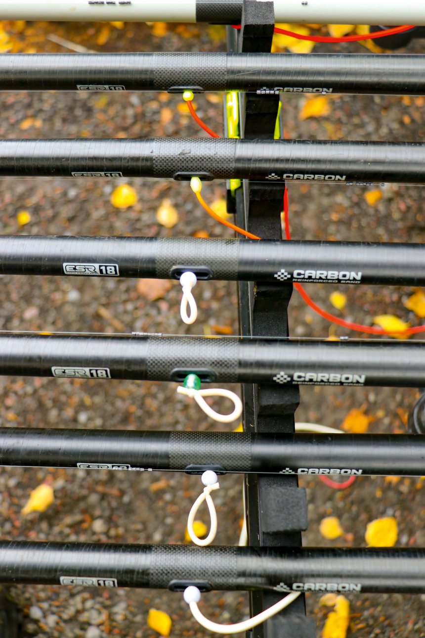 L’élastique intérieur destiné à la pêche des carpes doit se loger dans les deux premiers éléments de la grande canne. Cette longueur est nécessaire pour posséder une réserve suffisante que le poisson, en fonction de sa taille et de sa vigueur, va pouvoir solliciter. Selon les fabricants, la longueur de ces deux éléments peut varier, mais elle oscille entre 2,50 et 2,80m. Fred vous livre une astuce qui consiste à ménager une réserve supplémentaire. « Je laisse pendre à l’extérieur, au niveau de l’orifice du kit de combat, 50 à 60 cm d’élastique supplémentaire. En cas de prise d’un gros poisson inattendu, je garde alors toutes mes chances de capture. Le point de saturation est encore rallongé et cela me donne encore plus de souplesse. Cette réserve a une seconde utilité. Si je dois remplacer une portion d’élastique sur la partie supérieure, je n’ai pas besoin de remplacer l’ensemble. »