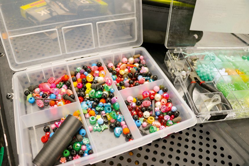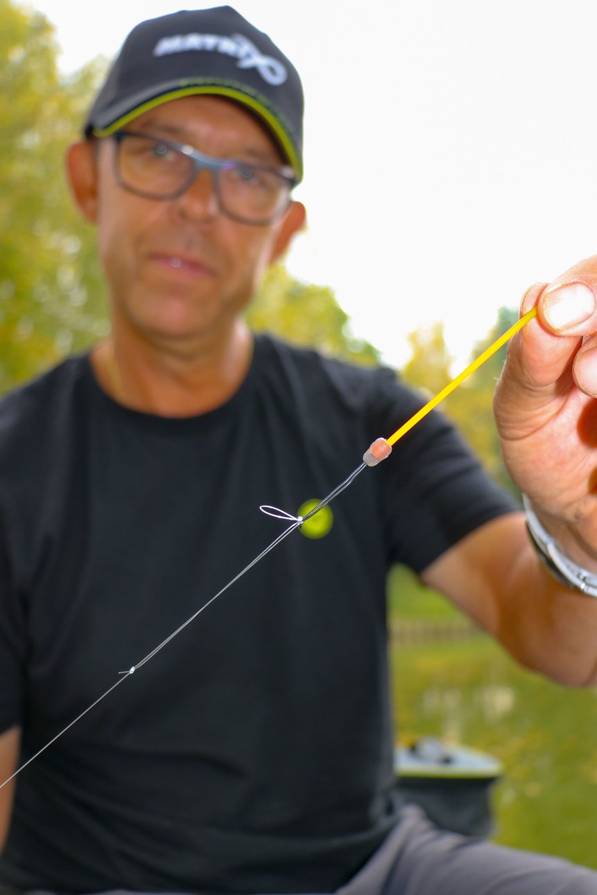 Cette réserve nécessite un aménagement, et Fred y voue une attention toute particulière que j’avoue moi-même avoir négligée jusque-là. « On ne peut pas laisser simplement pendre ce brin d’élastique, sinon au moindre déplacement de la ligne, de sondage, c’est à l’autre extrémité qu’il viendra pendouiller. Il faut installer une butée qui va permettre de tendre l’élastique à sa juste mesure et d’assurer un ferrage efficace. Mais il ne faut pas qu’elle emprisonne trop l’élastique au risque que le poisson ne parvienne pas à solliciter cette réserve. » La butée doit être choisie avec grand soin et Fred y a passé des heures. Il possède une mallette pleine, fruit de toutes ses recherches et pas seulement dans les rayons pêche. Ces butées, il les a pour la plupart déniché au rayon fantaisie/ loisir/création sous la forme de perles. Ce choix immense lui permet d’adapter parfaitement son diamètre interne à celui de l’élastique. Le but est d’obtenir l’équilibre parfait pour maintenir l’élastique en position, parvenir à régler facilement la tension et assurer une glisse optimale. « La perle doit serrer, mais ni trop ni trop peu ! » Comment y parvenir ? Il n’y a pas d’autre choix que de tâtonner ! Si vous êtes fidèle à une marque d’élastique, vous y arriverez facilement. Les fabricants en proposent des standardisées.