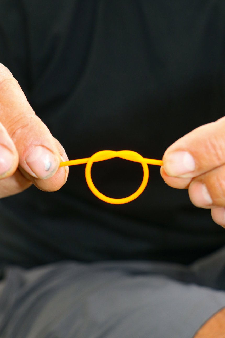 1. Débutez en réalisant un nœud simple avec l’élastique. Humidifiez-le et serrez fortement.
