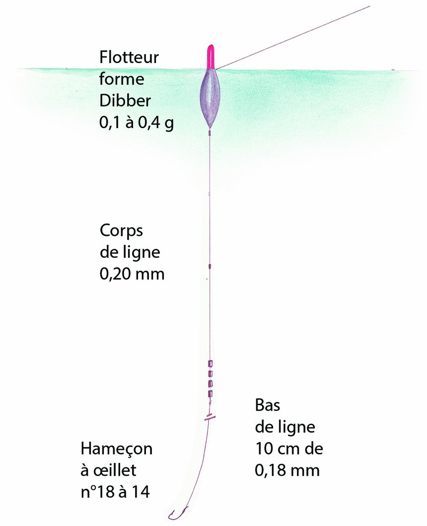 Un flotteur suffisamment court et aussi discret que possible est nécessaire pour faire évoluer l’appât au plus près de la surface sans que les poissons ne s’en méfient trop. Son poids dépend de la distance à atteindre, mais si votre moulinet est parfaitement garni et la canne d’une action adaptée, 3 à 4 g suffisent pour pêcher de 15 à plus de 25 mètres du bord, ce qui permet un beau champ de prospection.