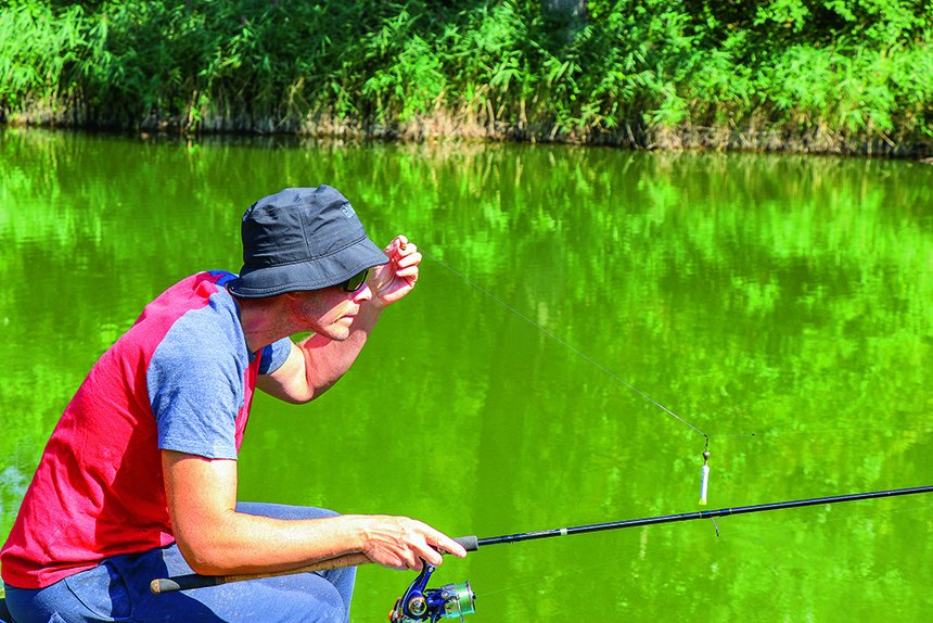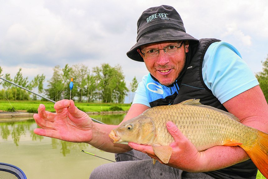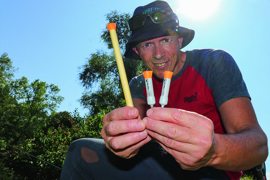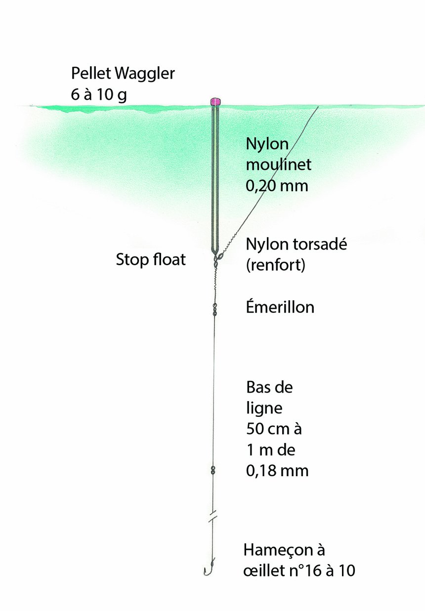 Pour y parvenir, l’utilisation d’une grande canne à emmanchements est indispensable. Elle permet de jongler avec les longueurs et de s’adapter à la position changeante des poissons. Afin que l’ombre de la canne ne devienne pas un handicap, faisant fuir les poissons positionnés peu profond, utilisez une ligne plutôt longue. Le flotteur est aussi discret et petit que possible. Il va falloir modifier sa position très régulièrement afin que l’appât évolue au niveau des carpes. Son lest doit simplement permettre de propulser l’appât au bon endroit (cf. schéma de montage). Pour ce jeu-là, je conçois ce que j’appelle une anti-ligne composée d’un petit flotteur et d’un gros Nylon !