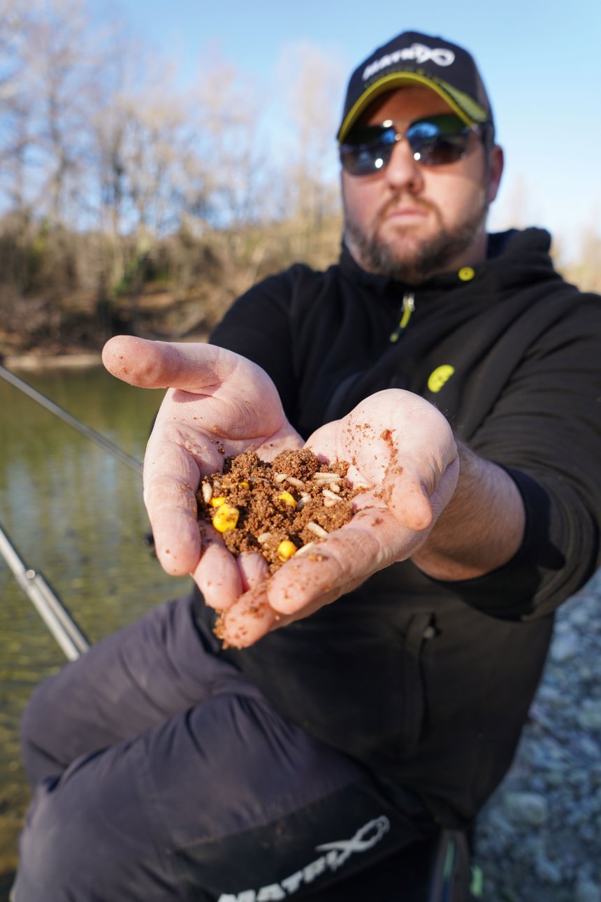 Les poissons semblant méfiants dans cette eau claire et encore froide, Charles adapte son amorce en conséquence. Il mélange ainsi deux parts de Gros Gardon (Champion Feed) –une amorce collante, très sombre et de granulométrie moyenne qui devrait plaquer le mélange sur le fond– et une part de Feeder (Champion Feed), un mélange explosif, avec quelques particules plus grosses, rouges pour certaines, qui devraient dériver. Pour finir, une poignée de pellets 2mm Special Method (Ringers Baits) à base de farine de poisson est intégrée. Deux ou trois cages, les mêmes que pour le sondage, servent à installer l’amorçage de départ. Elles sont chargées grassement en asticots blancs et en maïs. Au vu des conditions du jour, Charles préfère aborder la pêche façon method feeder, c’est-à-dire en rechargeant peu souvent mais en assez bonnes quantités.