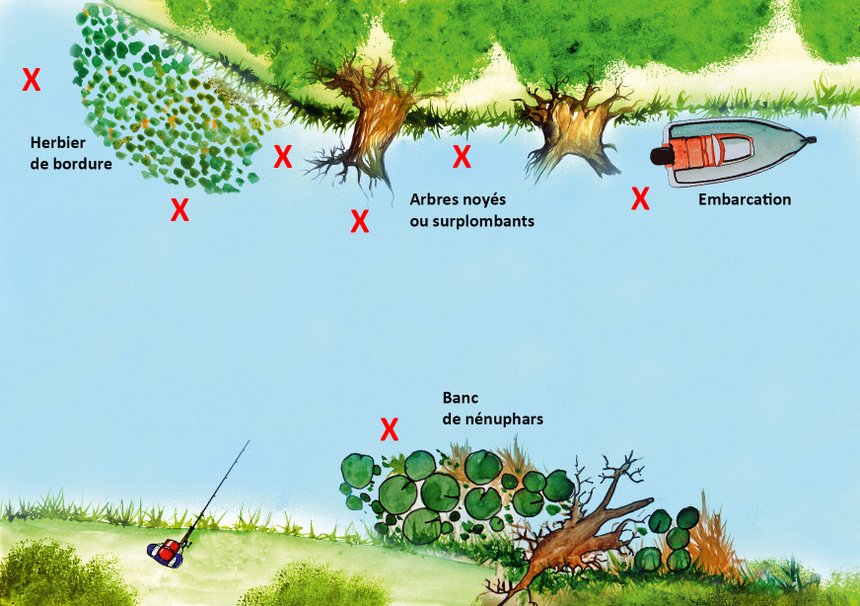 Sur de nombreux canaux, étangs et rivières, de nettes bandes de verdure apparaissent en effet dans les zones les moins profondes, souvent en bordure, parfois au large. Les herbiers préférés des pêcheurs sont les nénuphars, avec leurs grosses feuilles qui génèrent une ombre généreuse au profit des poissons. Une première analyse rapide consiste à tenter de repérer une éventuelle présence de poissons en activité à proximité.