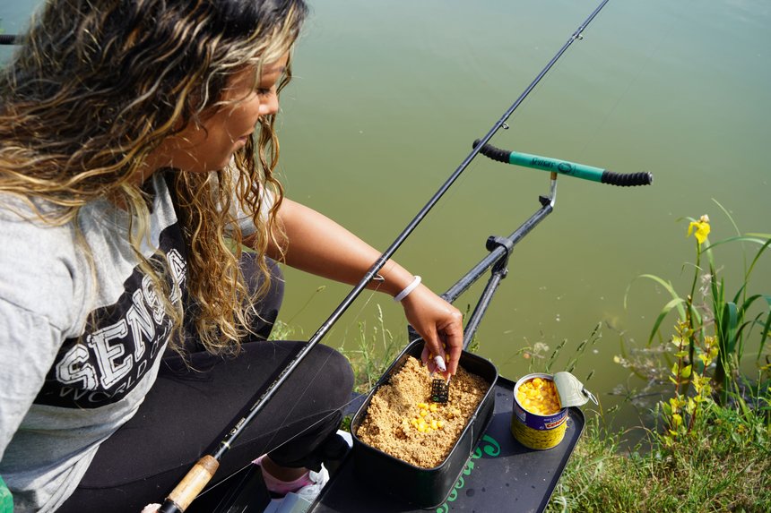 Dans ce plan d’eau public, on trouve de belles populations – carpes, carassins, brèmes, gardons–, ce qui explique le choix du method feeder chez Benoît, qui espère ainsi cibler une plus large variété de poissons. Pour les attirer sur le coup, Benoît, en gentleman, prépare pour Aurore un kilo d’amorce 3000 Carpe fine mouture (Sensas). C’est un mélange riche, collant et sucré qui peut attirer toutes sortes de beaux poissons, notamment en eau chaude. Aurore installe ses farines humidifiées dans un bac, sur sa desserte, ainsi qu’une boîte de grains de maïs qui seront intégrés dans l’amorce pour fixer les poissons et présentés aussi sur l’hameçon afin de cibler si possible les plus gros. Pas question d’appâts vivants aujourd’hui. Benoît et Aurore sont passionnés par la pêche mais savent s’affranchir des contraintes liées à la préparation de ces esches lorsque ces dernières ne sont pas indispensables. Les voilà prêts… Un sourire par ci, un bisou par-là, on est loin de l’ambiance habituelle de la compétition ! On rentre dans le vif du sujet. Benoît pique sur la baïonnette de son bas de ligne en 22/100 une micro-bouillette Oizing Boilies (Sonubaits) qui a la particularité de «fumer» dès le contact avec l’eau. Hameçon à œillet et montage au cheveu sont indispensables ici. L’appât est emprisonné dans le moulage du feeder pour qu’il reste bien au-dessus de l’amorce, une fois sur le fond. Bien placée au milieu de l’amorce, la micro-bouillette devrait pouvoir être aspirée en même temps que les farines, c’est le principe même du method feeder. Aurore de son côté pique un grain de maïs sur un hameçon n°12 et un bas de ligne de 50cm de nylon 20/100.