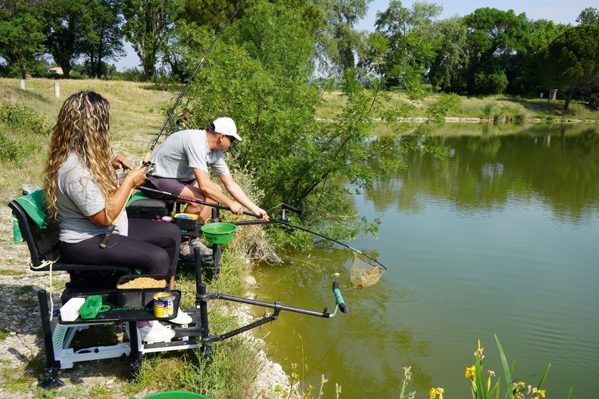 C’est sur les berges de l’étang des Bosquets, à Sérignan-du-Comtat (84) que j’ai rendez-vous avec Aurore et Benoît, couple à la ville et à la pêche ! Arrivé un peu en avance, je constate que les deux meilleurs postes sont déjà occupés. J’observe tout de même une petite activité dans un rétréci entre la berge et la pointe d’un îlot. La zone semble prometteuse et j’y accueille enfin Benoît et Aurore, qui arrivent… avec leurs enfants !