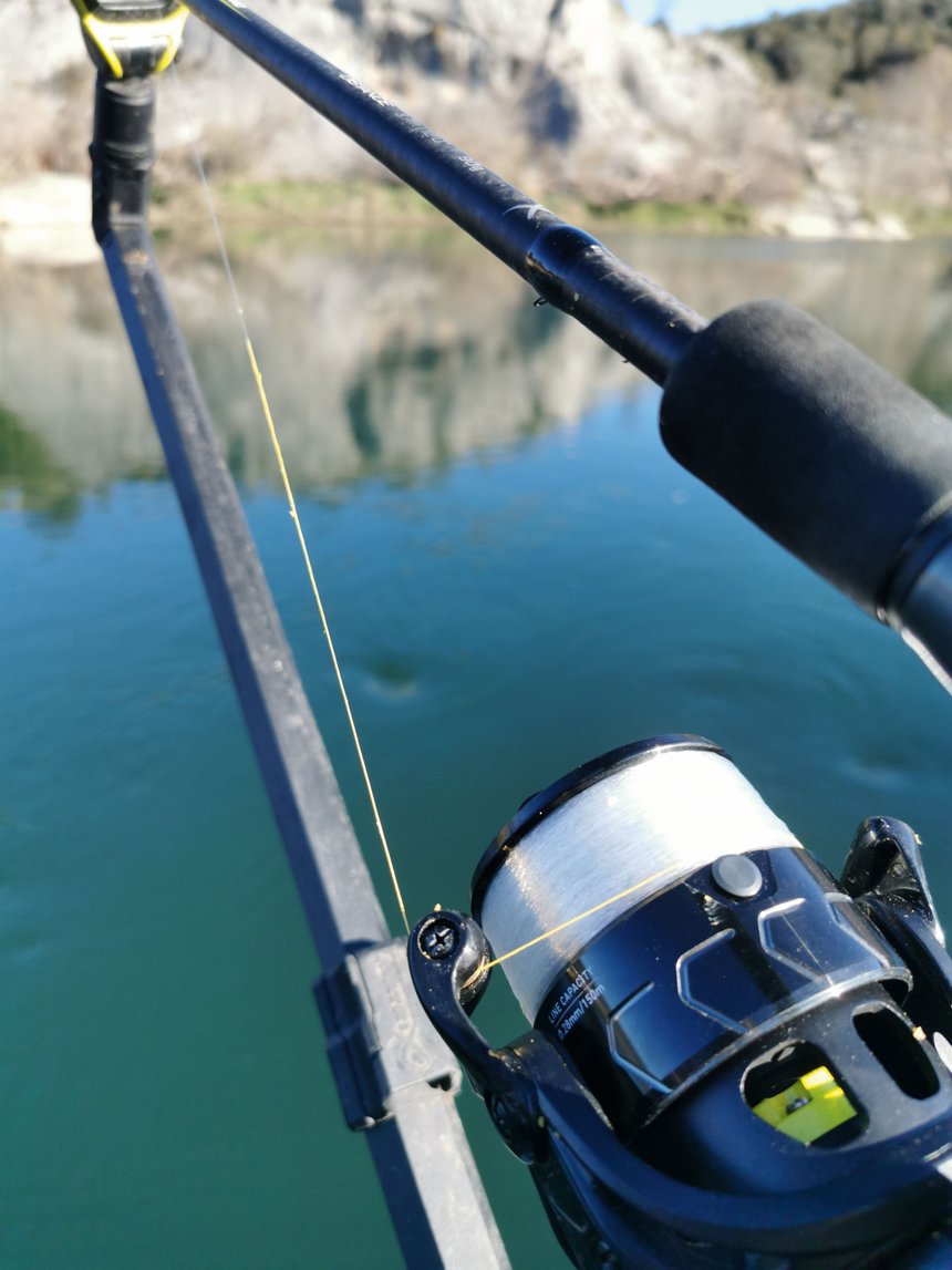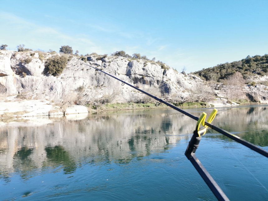 Par chance, je peux m’approcher à moins de vingt mètres de la berge en voiture et le bord de l’eau est accessible avec le matériel. Je m’installe rapidement et monte deux épuisettes, une à grosses carpes et une pour tout le reste. Je débute par un sondage méticuleux du poste. À première vue, la zone est idéale, le courant vient frapper la roche à mes pieds. Plus loin, à quinze mètres et en limite de courant, quelques remous délimitent la zone plus calme. Armé de ma canne à pêche et d’un feeder de 60 g, je dessine mentalement une bathymétrie du secteur. Comme je m’en doutais, le plus profond est en plein courant, tout près de moi, où l’eau vient creuser la berge. Plus en aval, le fond réduit, on voit même les cailloux, et plus loin, après le grand remous, presque en face, un banc de vase se forme. Mon feeder colle au fond lorsque je le fais glisser doucement. Je décide de pêcher à la limite entre le courant et la remontée, en face de moi. Le fond est caillouteux mais n’accroche pas, je pense qu’il y a quatre mètres d’eau.