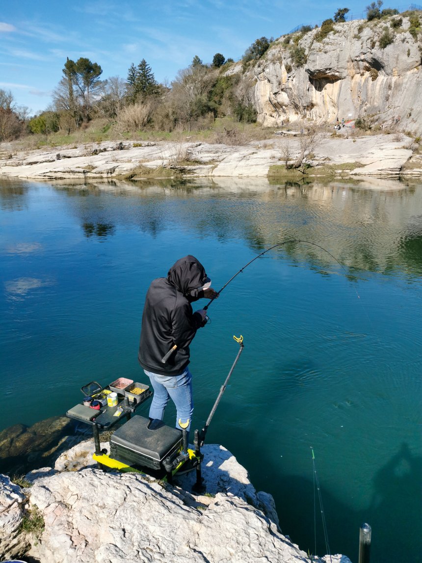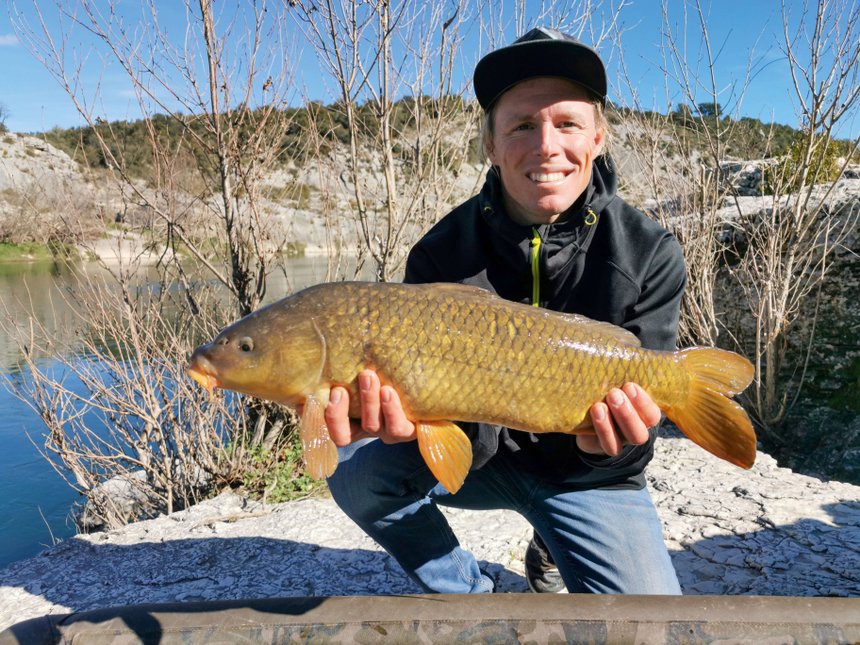Le montage au fond, les passages dans le fil recommencent en moins de deux minutes. Les poissons mangent ! La canne s’arrache du support et le scion vient embrasser la surface de l’eau ! C’est la première touche et cela semble être un beau poisson, certainement une carpe. J’arrive à défaire juste à temps la ligne du line clip et elle prend le large dans un mélange de crissement de frein et de coups de pick-up dans les doigts avec l’antiretour désactivé. Le rude combat se déroule canne basse, à contre-sens de la trajectoire du poisson, afin de le faire décoller du fond mais aussi remonter le courant. Ce n’est pas chose facile et malgré un matériel adapté, une canne de quatre mètres et de puissance 130 g n’est pas du luxe. Le poisson se met en travers dans le courant et joue de son poids. Finalement la carpe apparaît à mes pieds, au milieu de l’eau cristalline et dévoile ses couleurs dorées splendides. Les carpes communes de rivière sont des poissons musclés, souvent plus longs que larges et qui ont une puissance incomparable. Il n’empêche qu’elles sont aussi fragiles que leurs consœurs et un tapis de réception est indispensable pour les poser, afin de les décrocher et de faire une photo avant de les remettre à l’eau. Il ne me reste plus qu’à renvoyer une grosse cage pleine de graines et d’asticots. Les touches s’enchaînent et les poissons mis à l’épuisette s’accumulent. N’utilisant pas de bourriche pour la santé du poisson, je les dépose dans l’eau aussitôt décrochées. Entre cette bonne action et une pêche aussi proche, le banc devient méfiant. Ce n’est pas grave, ma journée est sauvée ! J’ai réussi avec un peu d’adaptation à faire une merveilleuse pêche pour un mois de février. Il est temps de rentrer, le froid m’envahit !