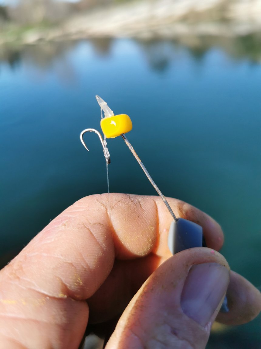 Je débute la partie par un amorçage massif avec des cages feeder de contenance large (pas XL), truffées de grains de maïs, sans serrer trop fort le tout, afin d’éjecter rapidement le contenu. Une fois l’amorçage réalisé sur une zone précise, une pêche d’attente peut commencer. Le premier eschage est réalisé avec un grain de maïs piqué sur un hameçon de 14 de forme arrondie, style Guru LWGF ou Matrix MXB-3. C’est la forme parfaite pour les grosses esches au feeder et les beaux poissons. Il est monté sur un bas de ligne en 16/100 en Nylon Yuki 3G invisible, pour plus de discrétion, d’une longueur de 80 cm pour se déployer dans le courant à la suite du feeder. Je pose la canne sur les supports avant et arrière et retire les mains pour éviter tout mouvement parasite. L’objectif de ces premières coulées est de piquer les poissons curieux, ce ne sont pas forcément les carpes mais plutôt des gros gardons, des carassins et même parfois des brèmes. Je laisse le montage en place jusqu’à quinze minutes et puis relance. Quarante-cinq minutes de pêche passent et enfin, un semblant d’activité se fait ressentir. Le scion, malgré sa puissance de 3 oz, bouge d’avant en arrière de façon désordonnée, cela s’arrête et reprend. Aucune touche franche ne donne le signal de ferrer. Ces passages dans le fil, malgré un Nylon de 30/100 dans le moulinet, donnent le ton ! Les gros poissons sont là et il faut vite changer le bas de ligne afin de ne pas casser dès la première et peut-être unique touche. Je change pour un 23,5/100, un hameçon de 10 Matrix MXC-4 à œillet et montage au cheveu avec un Push Stop en plastique. Sur le cheveu, deux grains de maïs sont installés. Je raccourcis la longueur à cinquante centimètres, afin de rapprocher l’appât de l’amorce.