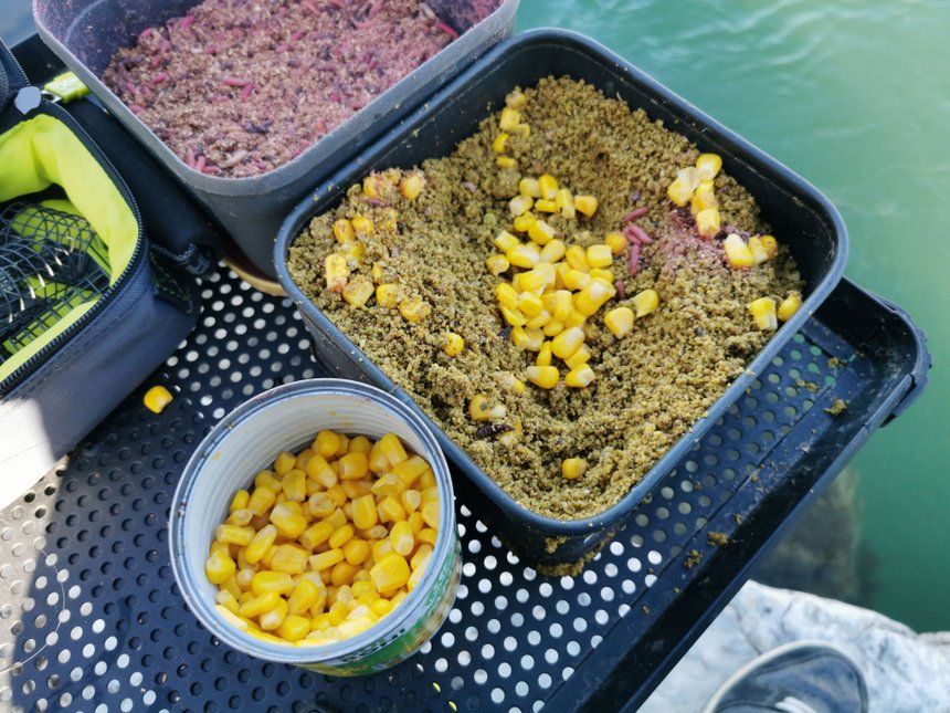 L’eau claire oblige à rester discret dans les déplacements sur la berge. Je finalise la préparation des esches et celle de l’amorce. J’ai un assortiment de farines riches et carnées. Il y a beaucoup de courant et il est important d’avoir un mélange collant. J’imprègne au maximum les farines d’eau sans pour autant les saturer, afin d’avoir un mélange restant bien dans la cage. Dans l’amorce, je prévois du maïs doux en boîte et quelques asticots. Le maïs ravira tous les gros poissons et les asticots auront le double effet de faire éclater l’amorce dans le feeder plus rapidement en début de partie et d’activer le « mode chasse » des carpes de passage, qui n’hésiteront pas à se saisir d’un gros bouquet esché sur un hameçon de 12 ou de 10 si nécessaire.