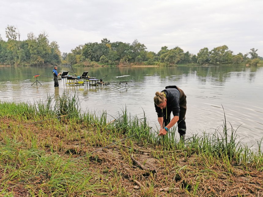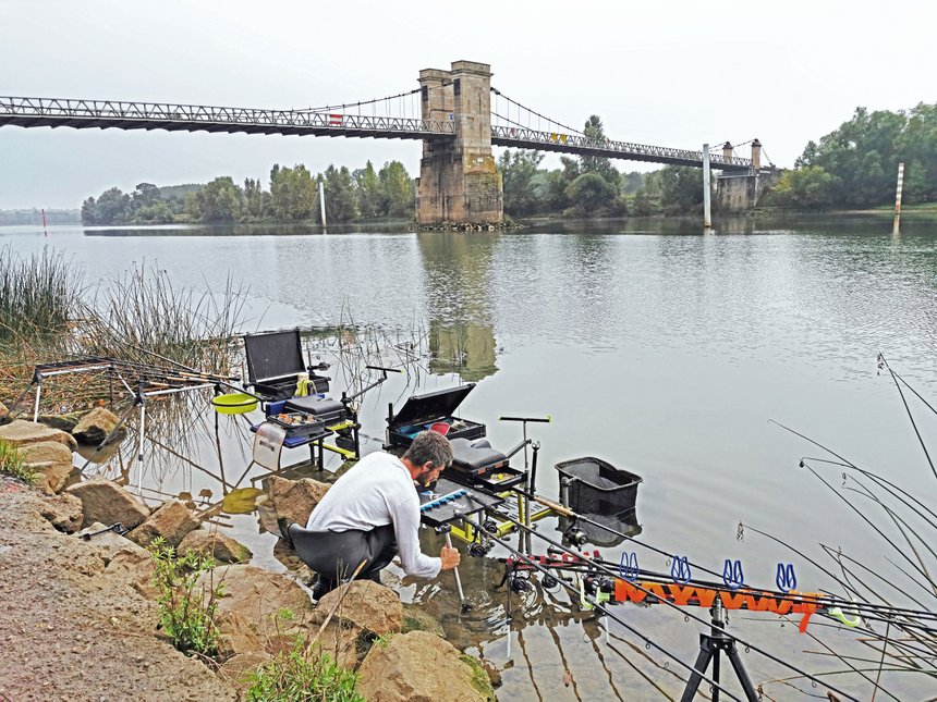 Les pêcheurs sont divisés en trois secteurs cette année. Un en aval, sur lequel il serait idéal de se retrouver dans les zones plus profondes, un deuxième au-dessus du pont de Montmerle où les deux chenaux sont marqués. Le dernier secteur fait face à une arrivée d’eau, où il vaudrait mieux tomber vers l’amont. La chance nous octroie une avant-aile pour la première manche du samedi et un n°7 le dimanche. c’est plutôt un bon tirage. Sur ce premier poste, nous devons nous installer dans l’eau, à 5-6 m du bord pour déployer correctement la bourriche. Pêcher dans l’eau requiert une installation minutieuse et sûre mais c’est aussi très confortable pour pêcher loin, rien ne venant contrarier les lancers. Je m’installe sur la droite, pour a priori pêcher les brèmes, Alex à ma gauche, prévoyant lui un coup à gardons, avec tout de même l’idée de pouvoir se rejoindre sur un même coup. Après sondage, nous mettons au point notre stratégie. Alexandre prévoit deux coups pour le gardon : un à 55 m avec amorçage lourd au départ, et un second, sans amorçage, à 20 m. De mon côté, je prévois un coup unique à 72 m, gardant en réserve deux cannes courtes pour rejoindre Alexandre sur son coup à 55 m si cela devenait nécessaire.