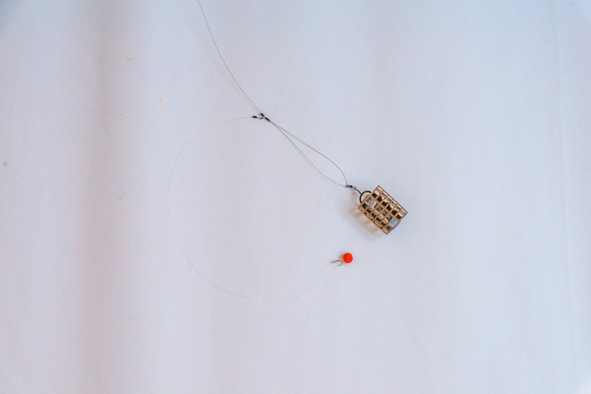 Recette de montage. Enfilez un stop float sur le corps de ligne. Puis un micro-émerillon baril ou un émerillon équipé d’une tétine d’ouverture rapide, qui supportera le bas de ligne. Enfilez un autre stop float pour emprisonner le micro-émerillon sur le corps de ligne. Les stop float coulissent et permettent de régler l’écartement entre le bas de ligne et le feeder. Emprisonnez un émerillon agrafe numéro 14 à 12 dans une grande boucle de 15 cm à l’extrémité du corps de ligne.