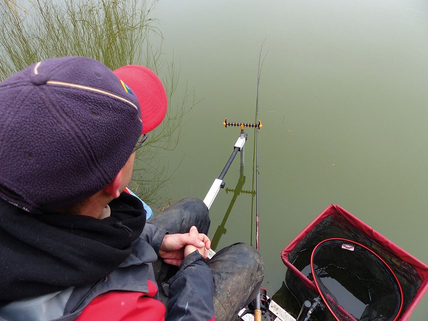 En observant son installation, je constate qu’Alexandre a éliminé tout superflu. Un petit fourreau pour les cannes et les moulinets, une caisse toute simple sur laquelle il accroche tablettes, bourriche et accessoires. Quelques boîtes et récipients complètent cette maigre panoplie. Devenue incontournable en carpodrome, la technique retenue aujourd’hui, le method feeder, permet de pêcher rapidement et avec précision les beaux poissons, les carpes en particulier. L’îlot qui trône au milieu du plan d’eau, à proximité duquel Alexandre compte déposer son amorçage, se situe à environ 45 m. Le vent est nul et l’espace de lancer est bien dégagé. Pour la canne, Alexandre choisit une Superba Champion League (Milo) de 3,30 m, en deux brins. Je suis un peu étonné car elle me semble un poil courte pour pêcher à cette distance mais Alexandre me rassure : « C’est une longueur idéale pour aller jusqu’à 50 m, dans de bonnes conditions, précise-t-il. Si le vent devait se lever, il faudrait forcer plus pour être précis et j’opterais alors pour une 3,50 m. »