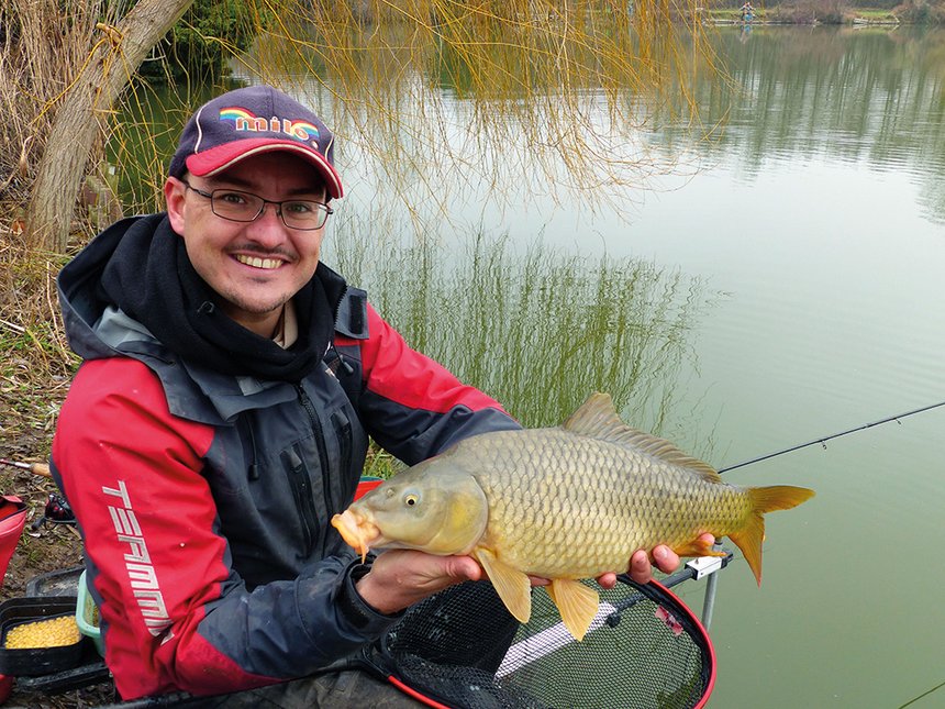 Quinze minutes plus tard, il est récompensé et enchaîne six captures au pain en moins d’une heure. Il termine avec quelques nouvelles belles carpes au large, les Sticky Method Pellets ayant fini par produire leur effet à retardement. Tout heureux, Alexandre ne s’attendait pas à une telle réussite, en raison du froid qui régnait ce jour-là. Dumbells blancs et pain de mie étaient de toute évidence les appâts du jour, ce qu’Alexandre n’avait pas mis beaucoup de temps à comprendre.