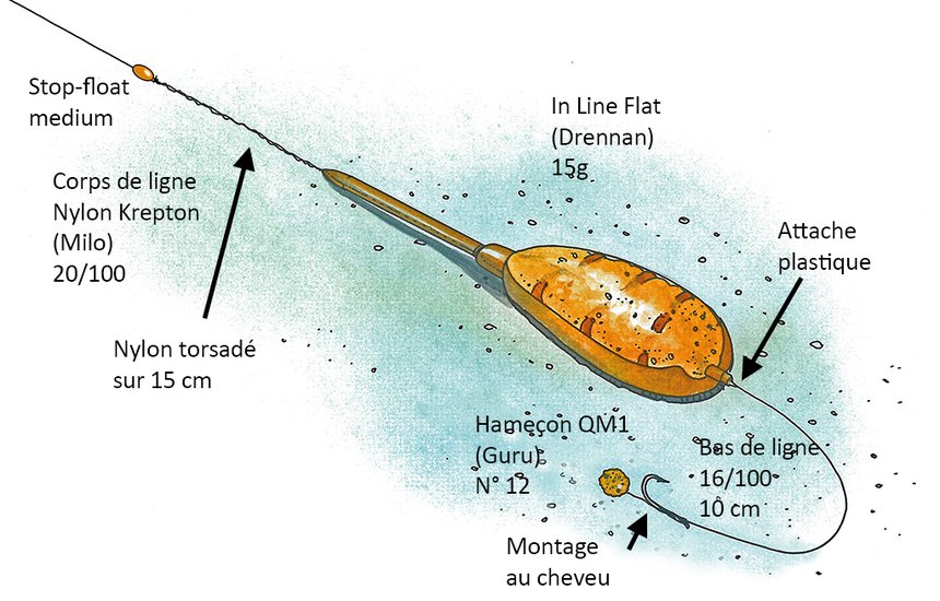 Pour caler sa distance et fronder sans repère visuel, Alexandre utilise, toujours dans la même direction, une fronde de puissance medium dont il tend systématiquement les élastiques au maximum. Il arrose ainsi une zone assez large (une vingtaine de mètres) au beau milieu de laquelle il pourra éventuellement déposer son montage, en cherchant à obtenir une présentation d’esche naturelle. Les pellets de frondage descendant lentement dans la couche d’eau, il arrive que les carpes viennent entre deux eaux, voire jusqu’en surface, pour s’en emparer. Le bas de ligne utilisé est ici plus long qu’avec le montage classique (30 cm à 2 m), permettant d’exploiter une bonne hauteur d’eau. Alexandre peut aussi laisser en suspension un simple bout de pain à une trentaine de centimètres au-dessus du fond, le temps que celui-ci se gorge d’eau et coule doucement. L’hameçon est alors un QM1 (Guru) n°12, équipé d’un cheveu et d’un stop-appât. Deux tronçons de 18 mm, prélevés à l’emporte-pièce, sont ainsi installés sur le cheveu dont la longueur doit tenir compte du fait qu’ils vont gonfler et qu’en aucun cas, ils ne finissent pas recouvrir la pointe de l’hameçon qui devra toujours rester parfaitement dégagée.