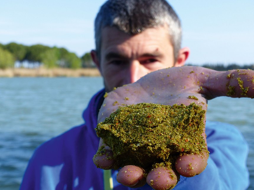 Le choix est pris de s’installer sur la berge battue par les vagues afin de profiter du courant et de l’eau agitée, facteurs favorisant l’activité des gros poissons. Avant même de monter son matériel, Alexandre prépare son amorce (voir encadré). Il introduit de l’eau une première fois, assez grossièrement, et laisse gonfler. Il prépare toujours son amorce au plus tôt, la veille même s’il a le temps, pour introduire un maximum d’eau et la rendre la plus inerte possible.