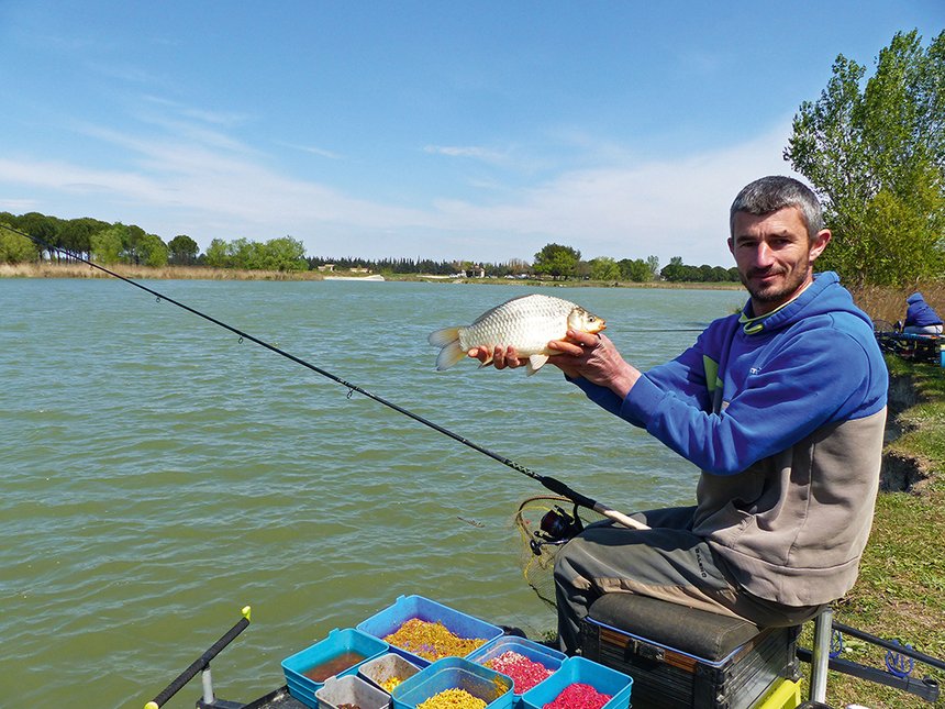 Le vent persistant empêchera de pêcher loin (25 m), mais le fond régulier et la pression de pêche, faible ici, devraient permettre de rapprocher les poissons près du bord sans trop de difficultés. La stratégie d’Alexandre est simple : amorcer un coup copieusement avec un très gros feeder en apportant farine, maïs, asticots, terreaux et casters afin de gaver rapidement les petits poissons présents. Il pêchera sur cet amorçage au feeder classique. Lorsque les poissons seront installés, il essaiera de bien analyser leur manière de mordre pour jongler ensuite entre method feeder et feeder classique. Ce dernier permet en effet d’apporter plus facilement, grâce au volume de la cage, asticots, terreaux et maïs en quantité.