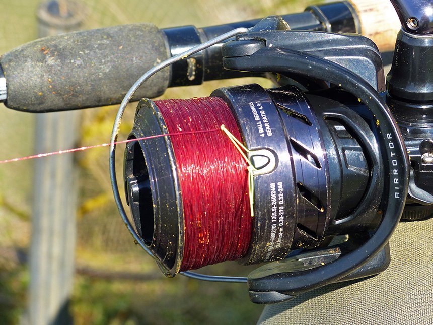 Quelques petites brèmes sont les premières arrivées sur le coup et de grands arrachages de canne trahissent la présence de poissons plus gros. Alexandre pêche avec un montage à plat classique afin de stabiliser au maximum l’esche sur le fond. Il sait par expérience que les plus beaux poissons viennent très près de la cage et peuvent même se nourrir directement à sa sortie, ce qui fait osciller le scion délicatement de l’avant vers l’arrière. Il faut alors comprendre comment les faire mordre. Le long bas de ligne est efficace un moment et va chercher les poissons autour du cou dans les mouvements d’eau et le courant, quelques carassins se laissent aussi avoir mais ça ne dure pas. Alexandre essaie alors le method feeder avec un tout autre bas de ligne : 10 cm de 20/100 avec hameçon Feeder Rigger (Matrix) n° 10, monté avec un cheveu sur lequel il noue une baïonnette afin de mettre en place un dumbell rouge pop-up.