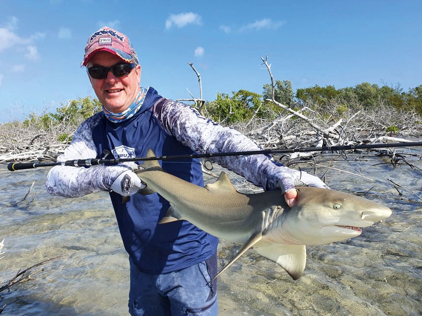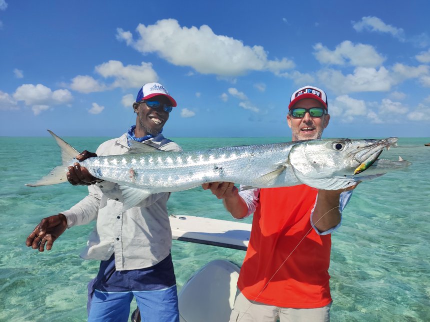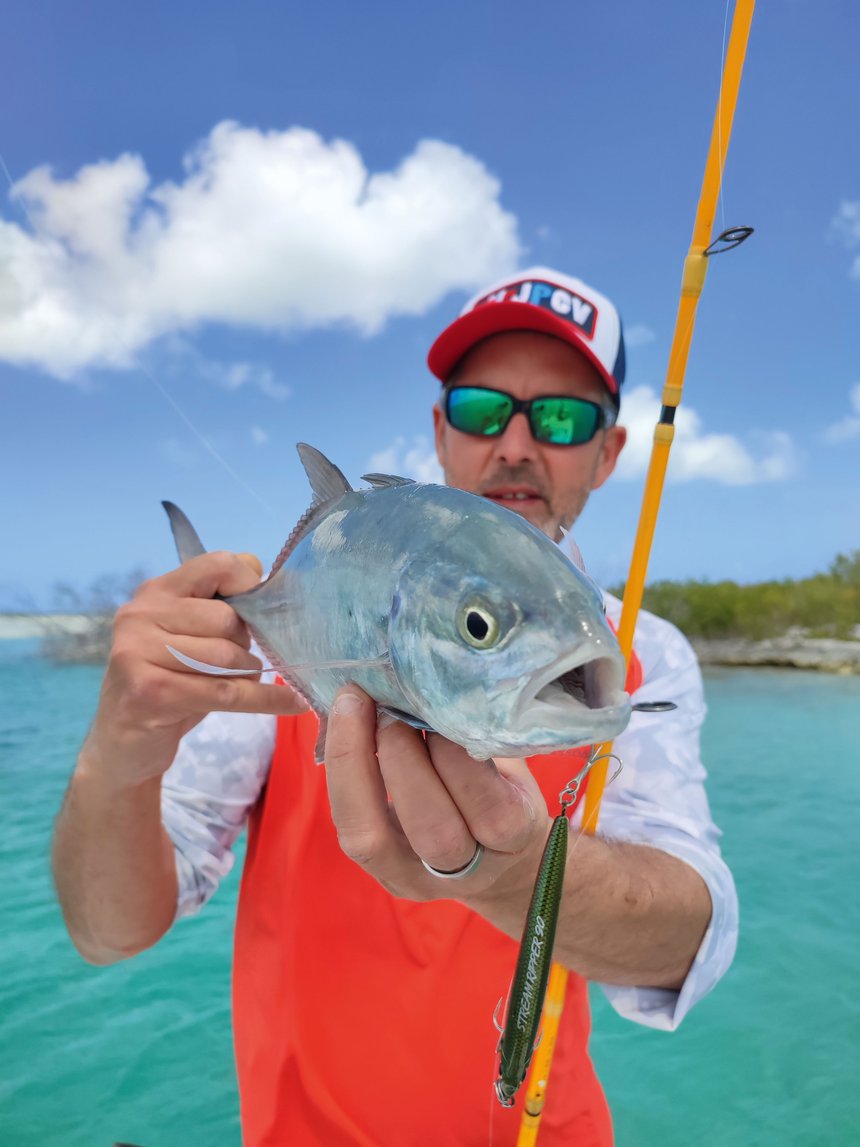 L’organisation au lodge est impeccable et chaque question trouve une réponse claire, ce qui est à souligner. L’ambiance est excellente et les pêcheurs présents sont ravis. Les repas à base de spécialités locales sont raffinés. Tout ici est fait pour que les pêcheurs soient dans les meilleures conditions. Au fil du séjour, les trigger fish (balistes) d’une belle couleur grise se sont montrés eux aussi passionnants à pêcher pour peu qu’on leur laisse le temps de prendre la mouche ou un mini leurre ! Les imitations de petites tailles, plutôt brunâtres, se sont révélées efficaces. Les permits sont très présents sur les flats le long des chenaux mais leur recherche ne fut pas fructueuse à cause d’énormes rafales de vent. Tous les pêcheurs le savent, le permit, c’est un peu la quête du Graal ! Au leurre, nous pêchons des zones limitrophes entre les flats et les chenaux, surtout dans des secteurs à fonds caillouteux. Le lodge dans lequel nous séjournons est le seul qui permet de pêcher la meilleure zone de Crooked Island et d’Acklins la même semaine ! Les requins aussi sont intéressés par nos leurres, mais surtout par ce qui se débat au bout de nos cannes. L’un d’entre eux viendra me chiper un barracuda de 60 cm au bout de ma ligne et se laissera prendre. Certains secteurs sont de véritables aquariums. C’est promis, nous reviendrons !